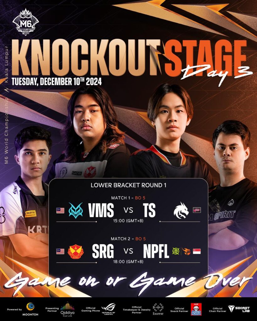 ការប្រកួតវគ្គ Knockout Stage ក៍ដូចជា TOP 8 ថ្ងៃទី៣ ក្នុងព្រឹត្តិការណ៍ M6 World Championship ដោយ Team Vamos ជួប Team Spirit និង Selangor Red Giant ជួប NIP Flash ការប្រកួត BO5 នឹងត្រូវរកឃើញ ២ក្រុម ធ្លាក់ចេញ ខណ:ក្រុមដែលឈ្នះនឹងឡើងទៅកាន់វគ្គបន្ត នៅថ្ងៃនេះ។