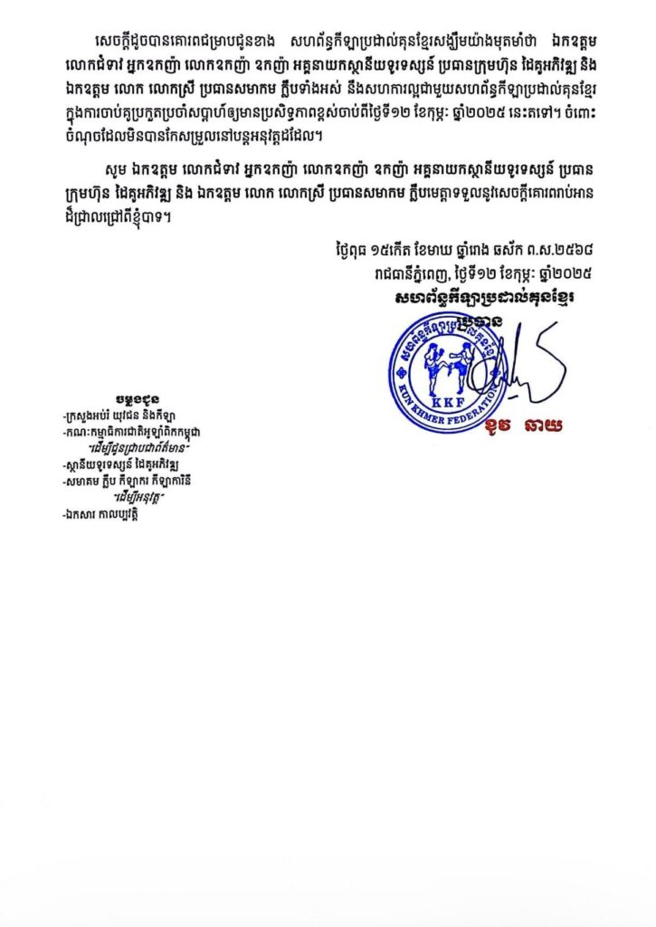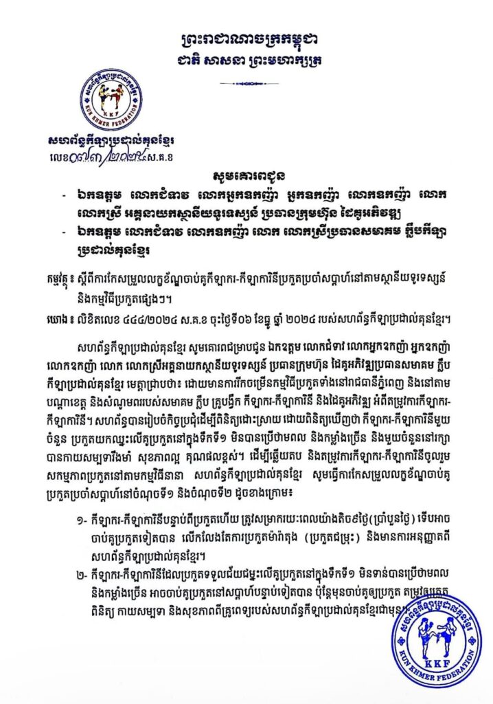 សហព័ន្ធកីឡាប្រដាល់គុនខ្មែរ កាលពីថ្ងៃទី១២ កុម្ភ: បានចេញសេចក្តីជូនដំណឹងស្តីពីការកែសម្រួលលក្ខខ័ណ្ឌចាប់គូកីឡាករ កីឡាការិនីប្រកួតប្រចាំសប្តាហ៍នៅតាមស្ថានីយទូរទស្សន៍ និងកម្មវិធីប្រកួតផ្សេងៗ មាន ២ចំណុច។
