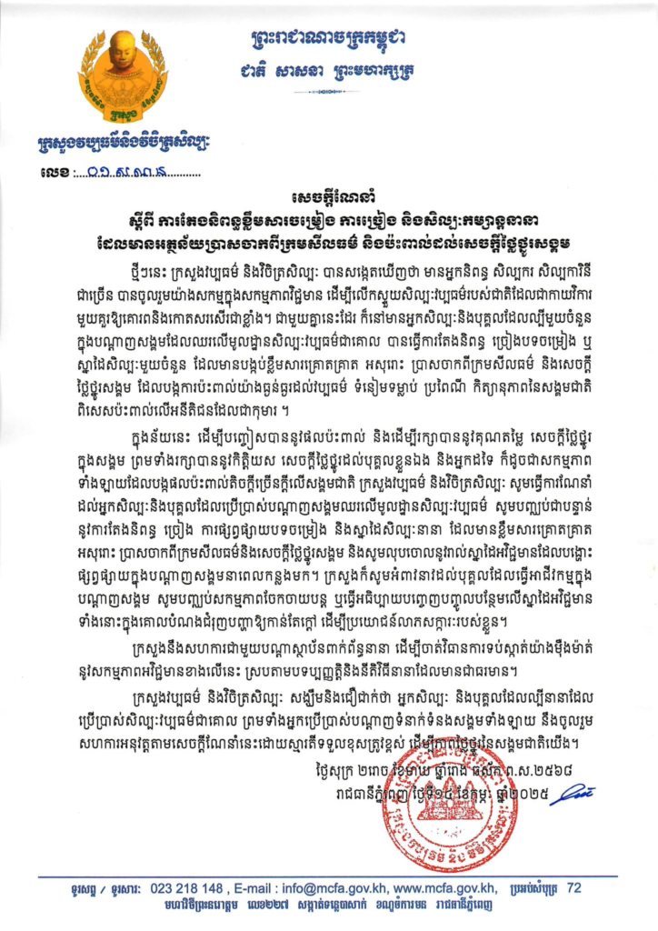 នៅថ្ងៃសុក្រ ទី១៤ ខែកុម្ភៈ ឆ្នាំ២០២៥ នេះ ក្រសួងវប្បធម៌ និងវិចិត្រសិល្បៈ បានចេញសេចក្តីណែនាំនៅលើបណ្ដាញសង្គម ស្តីពីការតែងនិពន្ធខ្លឹមសារចម្រៀង ការច្រៀង និងសិល្ប:កម្សាន្តនានា ដែលមានអត្ថន័យប្រាសចាកពីក្រមសីលធម៌ និងប៉ះពាល់ដល់សេចក្តីថ្លៃថ្នូរសង្គម។