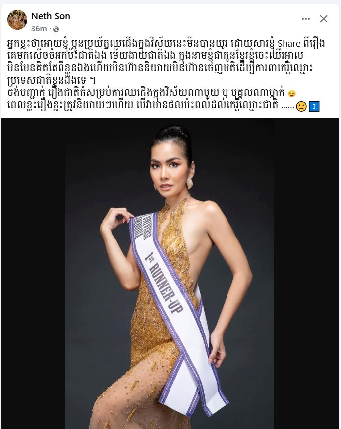 បវរកញ្ញាមកពីខ្មែរក្រោមរូបនេះបន្តបានបង្ហោះសំណេររៀបរាប់ថា ៖ «អ្នកខ្លះថាឱ្យខ្ញុំ ប្អូនប្រយ័ត្នឈជើងក្នុងវិស័យនេះមិនបានយូរ ដោយសារខ្ញុំ Share ពីរឿងគេមកសើចចំអកប៉ះជាតិឯង មើលងាយជាតិឯង ក្នុងនាមខ្ញុំជាកូនខ្មែរខ្ញុំចេះឈឺរអាល មិនមែនគិតតែពីខ្លួនឯង ហើយមិនហ៊ាននិយាយ មិនហ៊ានចេញមតិ ដើម្បីការពាកេរ្តិ៏ឈ្មោះប្រទេសជាតិខ្លួនឯងទេ ។ ចង់បញ្ជាក់ រឿងជាតិធំសម្រប់ការឈជើងក្នុងវិស័យណាមួយ ឬ បុគ្គលណាម្នាក់ ពេលខ្លះរឿងខ្លះត្រូវនិយាយៗហើយ បើវាមានផលប៉ះពល់ដល់កេរ្តិ៍ឈ្មោះជាតិ»។
