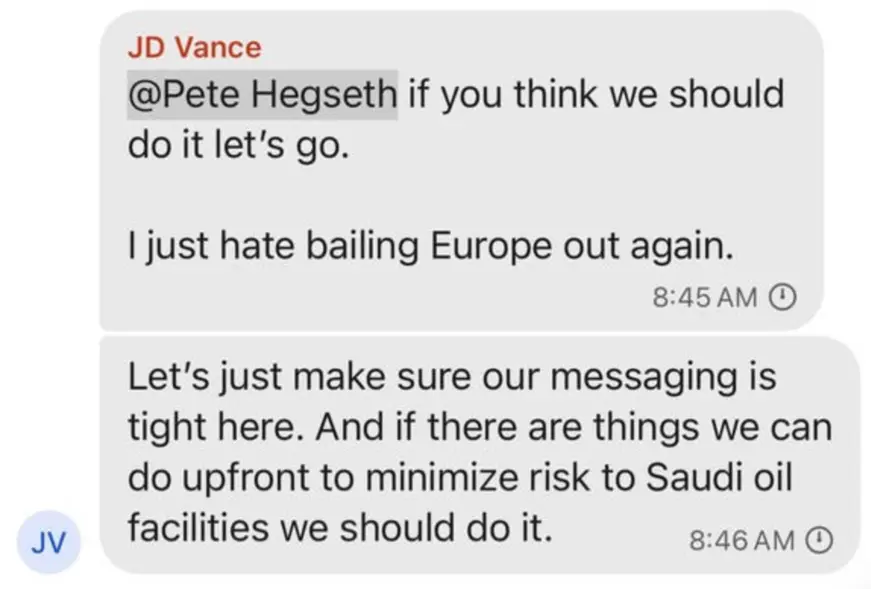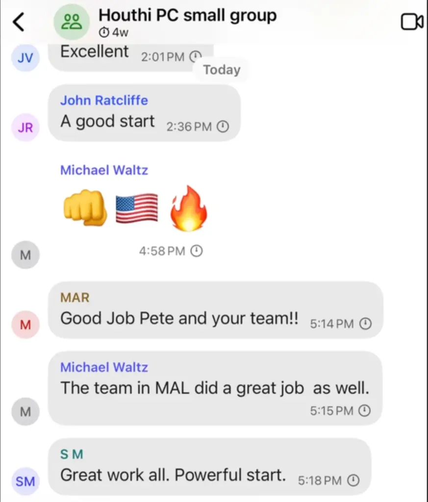 សូមជម្រាបថា គ្រុបឆាតនេះបានបង្កើតឡើងដើម្បីពិភាក្សាគ្នាលើព័ត៌មានលម្អិតប្រតិបត្តិការដូចជា ការកំណត់គោលដៅ អាវុធ និងពេលវេលានៃការវាយប្រហារជាដើម ហើយសមាជិកក្នុងគ្រុបនេះមានសុទ្ធតែថ្នាក់ដឹកនាំកំពូលៗរបស់អាមេរិក ដូចជា៖ អនុប្រធានាធិបតី JD Vance រដ្ឋមន្ត្រីការពារជាតិ Pete Hegseth រដ្ឋមន្ត្រីការបរទេស Marco Rubio នាយកស៊ើបការណ៍សម្ងាត់ជាតិ Tulsi Gabbard និងជំនួយការជាន់ខ្ពស់ Stephen Miller ផងដែរ។ Group នេះ គឺមានការពិភាក្សាគ្នាលើព័ត៌មានលម្អិតប្រតិបត្តិការដូចជាគោលដៅ អាវុធ និងពេលវេលានៃការវាយប្រហារជាដើម៕
