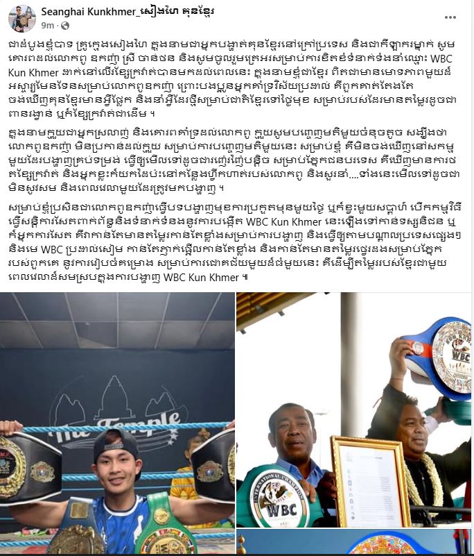 លោក ធីម សៀងហៃ គ្រូបង្ហាត់គុនខ្មែរ កំពុងរស់នៅ ក្នុងប្រទេសបារាំង នៅព្រឹកថ្ងៃទី១ មេសានេះ បានបញ្ចេញមតិនៅលើបញ្ដាញសង្គមហ្វេសបុក បន្ទាប់ពីឃើញវត្តមាននៃការបង្ហាញ WBC Kun Khmer ដាក់នៅលេីរខ្សែក្រវ៉ាត់ នៅប្រទេសកម្ពុជា។