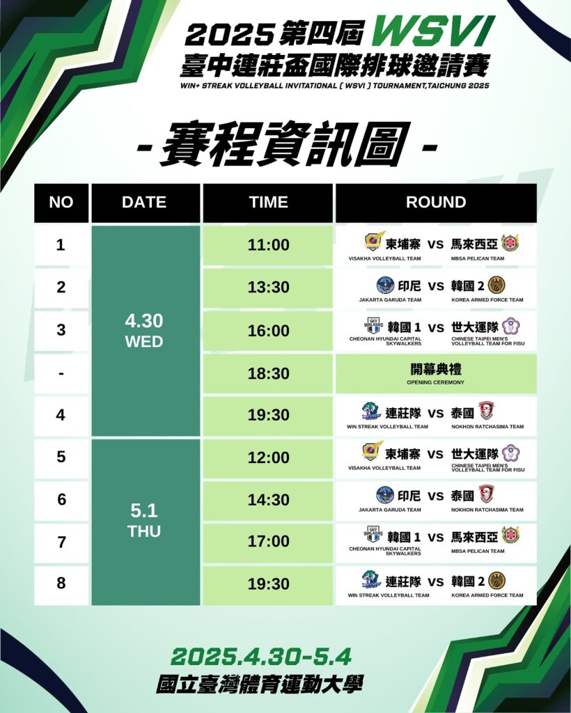 ក្លិបបាល់ទះវិសាខា តំណាងកម្ពុជា ត្រៀមការពារតំណែងជើងឯកនៅក្នុងពានរង្វាន់ The Win Streak Volleyball Invitational នៅតៃវ៉ាន់ ដែលគ្រោងនឹងចាប់ផ្តើមប្រកួតពីថ្ងៃទី៣០ ខែមេសា ដល់ថ្ងៃទី៤ ខែឧសភា ឆ្នាំ២០២៥។