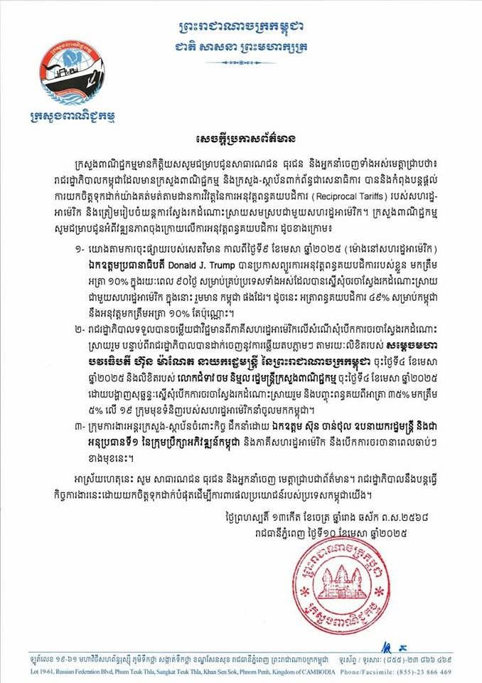 បន្ទាប់ពីប្រធានាធិបតីសហរដ្ឋអាមេរិកប្រកាសព្យួរការអនុវត្តពន្ធគយបដិការ, នៅថ្ងៃព្រហស្បតិ៍ ទី ១០ ខែមេសានេះ ក្រសួងពាណិជ្ជកម្មកម្ពុជាបានឲ្យដឹងថា រាជរដ្ឋាភិបាលទទួលបានចម្លើយជាវិជ្ជមានពីភាគីសហរដ្ឋអាម៉េរិកលើសំណើសុំបើកការចរចាស្វែងរកដំណោះស្រាយរួម បន្ទាប់ពីរាជរដ្ឋាភិបាលបានដាក់ចេញនូវការឆ្លើយតបភ្លាមៗ តាមរយៈលិខិតរបស់ សម្ដេចមហាបវរធិបតី ហ៊ុន ម៉ាណែត នាយករដ្ឋមន្ត្រី នៃព្រះរាជាណាចក្រកម្ពុជា និងលិខិតរបស់ លោកជំទាវ ចម និម្មល រដ្ឋមន្ត្រីក្រសួងពាណិជ្ជកម្ម កាលថ្ងៃសុក្រ ទី៤ ខែមេសា ឆ្នាំ២០២៥ ដោយបង្ហាញសុច្ឆន្ទៈស្នើសុំបើកការចរចាស្វែងរកដំណោះស្រាយរួម និងបញ្ចុះពន្ធគយពីអត្រា ៣៥% មកត្រឹម ៥% លើ ១៩ ក្រុមមុខទំនិញរបស់សហរដ្ឋអាមេរិកនាំចូលមកកម្ពុជា។