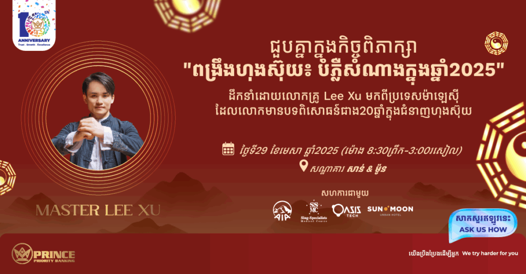 ក្នុងឱកាសខួបលើកទី10 ធនាគារ ព្រីនស៍ នឹងរៀបចំសិក្ខាសាលាផ្តាច់មុខស្តីពី ហុងស៊ុយ ដែលដឹកនាំដោយលោកគ្រូ Lee Xu មកពីប្រទេសម៉ាឡេស៊ី។ នៅក្នុងការបញ្ចូលគ្នារវាងហិរញ្ញវត្ថុ និងទ្រព្យសម្បត្តិ ធនាគារ ព្រីនស៍នឹងរៀបចំការជួបជុំតែមួយគត់ សម្រាប់អតិថិជនសេវាធនាគារអាទិភាព ដែលប្រព្រឹត្តទៅនៅថ្ងៃអង្គារ ទី29 ខែមេសា ឆ្នាំ2025 នៅសណ្ឋាគារ សាន់&ម៉ូន។