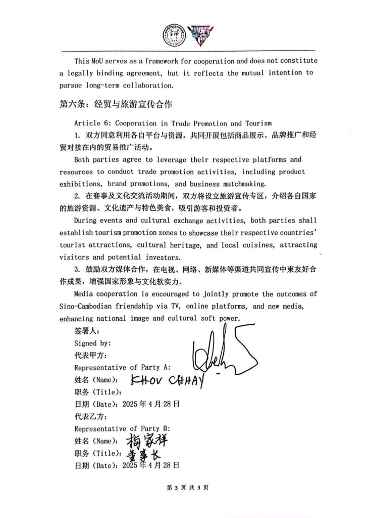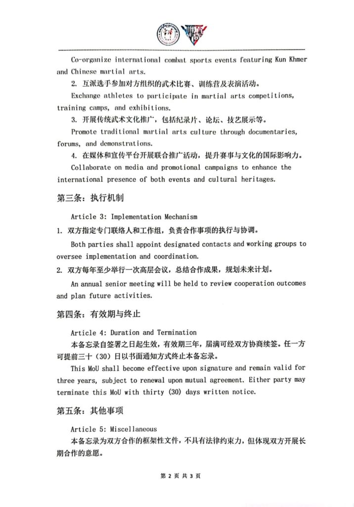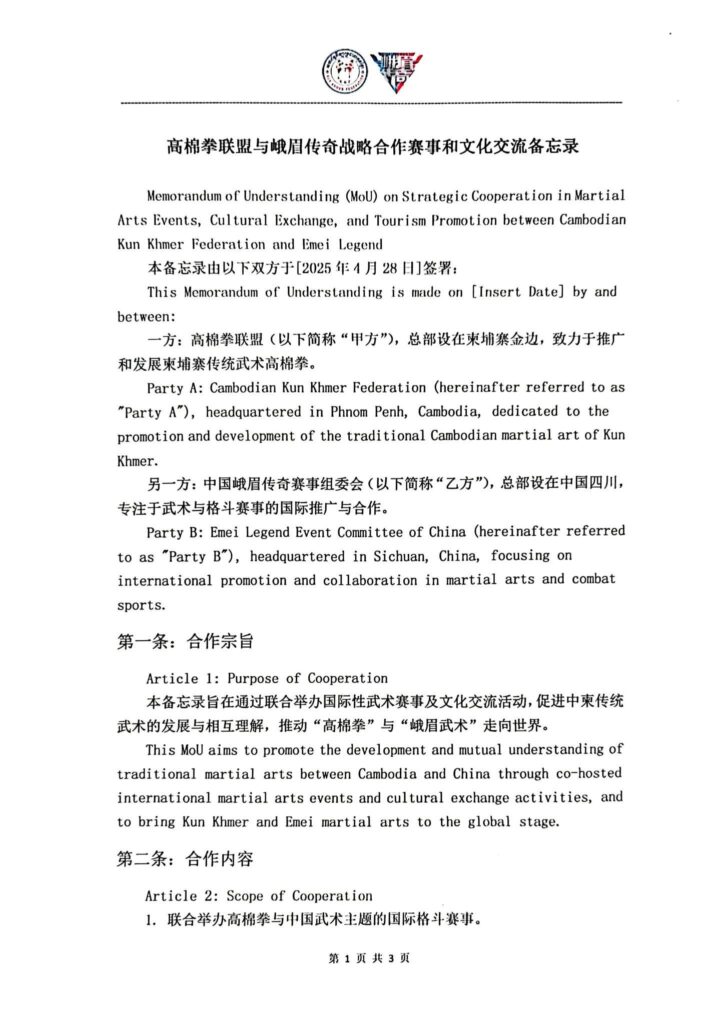 ឯកឧត្តម ប្រធានប្រធានសហព័ន្ធកីឡាប្រដាល់គុនខ្មែរ បានចុះអនុស្សរណៈយោគយល់គ្នា ររវាងសហព័ន្ធកីឡាប្រដាល់គុនខ្មែរ និង ស្ថាប័ន E-Mei Legend ស្តីពីកិច្ចសហប្រតិបត្តិការយុទ្ធសាស្ត្រព្រឹត្តិការណ៍កីឡាយុទ្ធគុន និងការផ្លាស់ប្តូរវប្បធម៌ វិនិយោគនិងទេសចរណ៍ ក្រោមអធិបតីភាពលោកអភិបាលក្រុងផឹងចូវ ចំណុះក្រុងឆឹងទូ នៃខេត្តស៊ីឈួន សាធារណៈរដ្ឋប្រជាមានិតចិន៕