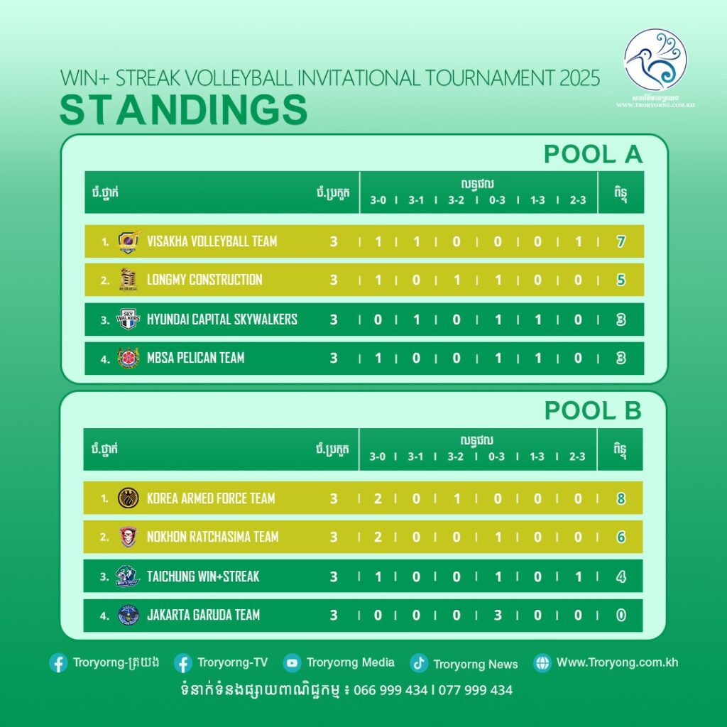 ចំណាត់ថ្នាក់ការប្រកួត Win+Streak Volleyball Invitational Tournament ៖