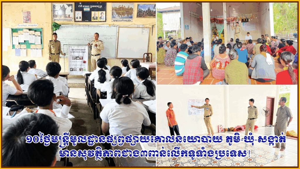 ក្នុងរយៈពេល១០ថ្ងៃ មន្រ្តីអាជ្ញាធរមានសមត្ថកិច្ចបានបន្តធ្វើសកម្មភាពផ្សព្វផ្សាយគោលនយោបាយភូមិ-ឃុំ-សង្កាត់មានសុវត្ថិភាពជាង៣ពាន់លើក។ បើតាមរបាយការណ៍ដែលក្រុមមន្រ្តីព័ត៌មាននៃក្រុមអ្នកនាំពាក្យក្រសួងមហាផ្ទៃទទួលបាន ការផ្សព្វផ្សាយគោលនយោបាយនេះ បានធ្វើឡើងនៅតាមវេទិកាសាធារណៈ តាមខ្នងផ្ទះ សាលារៀន វត្តអារាម និងកម្មវិធីនានា ដែលមានប្រជាពលរដ្ឋចូលរួមសរុបជាង១សែននាក់។