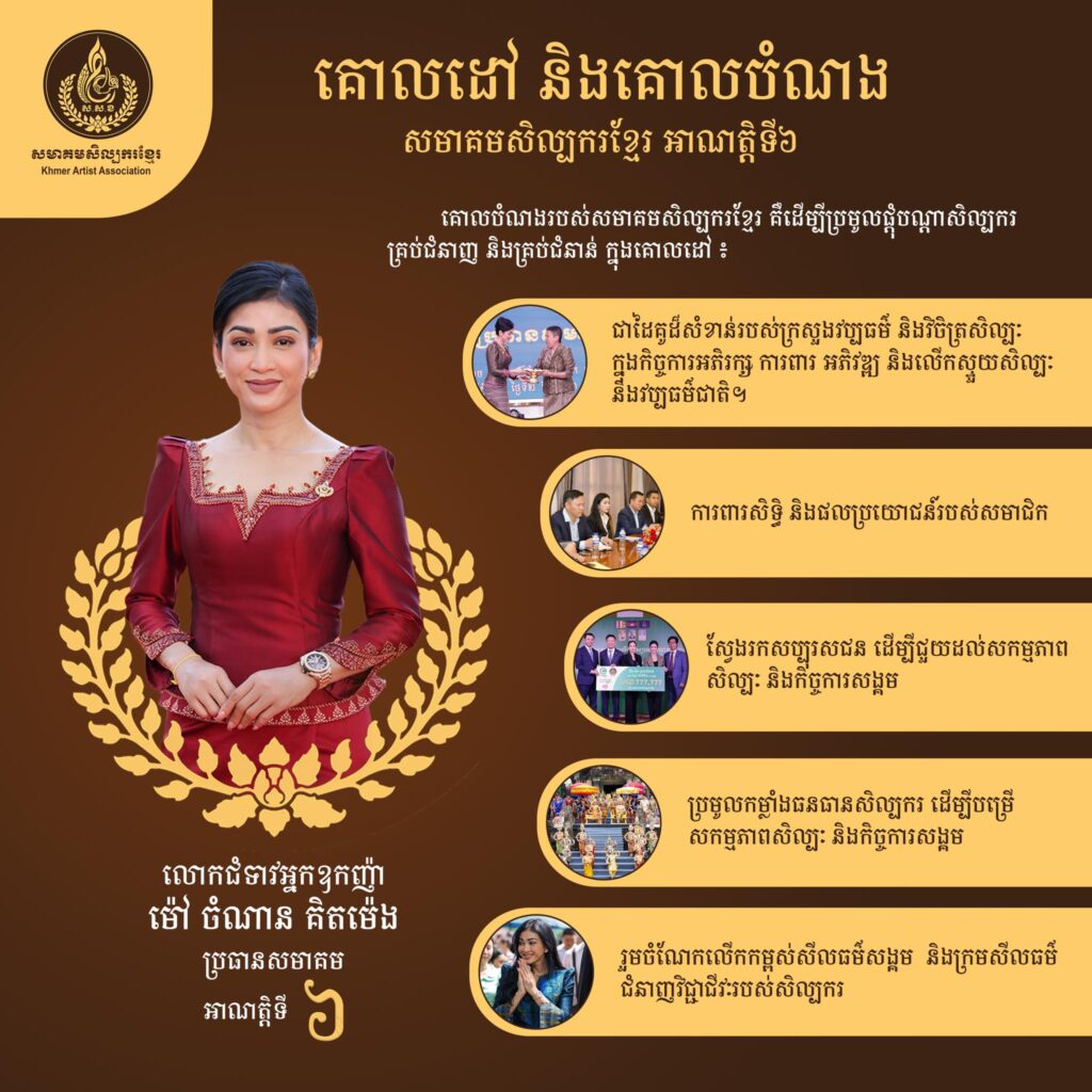 លក្ខន្តិកៈរបស់សមាគមសិល្បករខ្មែរ នៅក្នុងជំពូកទី១ ប្រការទី១ ចែងថា ៖ គោលបំណង និងគោលដៅ សមាគមសិល្បករខ្មែរ អាណត្តិទី៦ គឺដើម្បីប្រមូលផ្តុំបណ្តាសិល្បករ គ្រប់ជំនាញ និងគ្រប់ជំនាន់ ក្នុងគោលដៅ៖