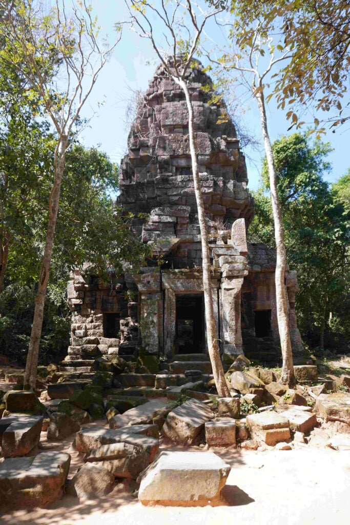 ប្រាសាទតាក្របី សង់ឡើងពីថ្មភក់មានរាងបួនជ្រុងស្មើរជាទម្រង់ប្រាសាទទោល មានកម្ពស់ប្រមាណ ២៥ ម៉ែត្រ ដែលមានខ្លោងទ្វារបួន ខ្លោងទ្វារសំខាន់បែរទៅទិសខាងកើត។ តួប្រាសាទមានប្លង់រាងកាកបាទបែរមុខទៅកើត ខ្លោងទ្វារខាងកើតមានប្រវែងវែងជាងតិចតួចខ្លោងទ្វារបីផ្សេងទៀត។ ខឿនប្រាសាទទាប ឯផ្នែកខាងក្រោមបង្អស់សាងពីថ្មបាយក្រៀម ហើយផ្នែកខាងលើសាងពីថ្មភក់ទាំងអស់ ដំបូលសាងរាងមូលត្រង់រៀបជា ៥ជាន់ឡើង។ ចំណែកឯដំបូលខ្លោងទ្វារសាងលយបង្ហាញឱ្យឃើញហោជាងច្បាស់។ នៅលើប្រាង្គប្រាសាទទាំងមូល មានតែថ្មភក់ដែលមិនទាន់ឆ្លាក់ចេញជាក្បាច់លម្អអ្វីឡើយ គ្រាន់តែបានដាប់ថ្មឱ្យចេញជារូបរាងហោជាង ឬផ្តែរទ្វារប៉ុណ្ណោះ។ នៅប្រាសាទនេះឃើញមានសក្ការៈមានថ្មធម្មជាតិ ដែលបុរាណវិទូហៅថា ស្វយម្ភូលិង្គ។