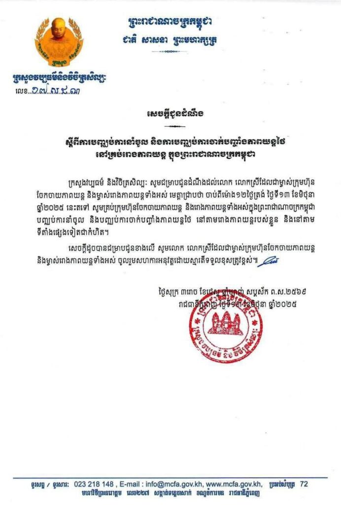 ដោយសារតែភាគីថៃ មិនព្រមបើកច្រកព្រំដែនដែលខ្លួនបិទជាឯកតោភាគី ពេលនេះក្រសួងវប្បធម៌ និងវិចិត្រសិល្បៈ និងក្រសួងព័ត៌មាននៃព្រះរាជាណាចក្រកម្ពុជា បានដាក់ចេញនូវវិធានការឱ្យម្ចាស់ស្ថានីយទូរទស្សន៍ទាំងអស់ និងរោងភាពយន្តទាំងអស់នៅទូទាំងប្រទេស បញ្ឈប់ការចាក់ផ្សាយ និងបញ្ចាំងខ្សែរឿងភាគ និងភាពយន្តថៃគ្រប់ប្រភេទនៅលើកញ្ចក់ទូរទស្សន៍ និងរោងភាពយន្តចាប់ពីម៉ោង១២យប់ ថ្ងៃទី១២ ខែមិថុនា ឆ្នាំ២០២៥ និងពីម៉ោង ១២ ថ្ងៃត្រង់ ថ្ងៃទី ១៣ ខែមិថុនា ឆ្នាំ ២០២៥។
