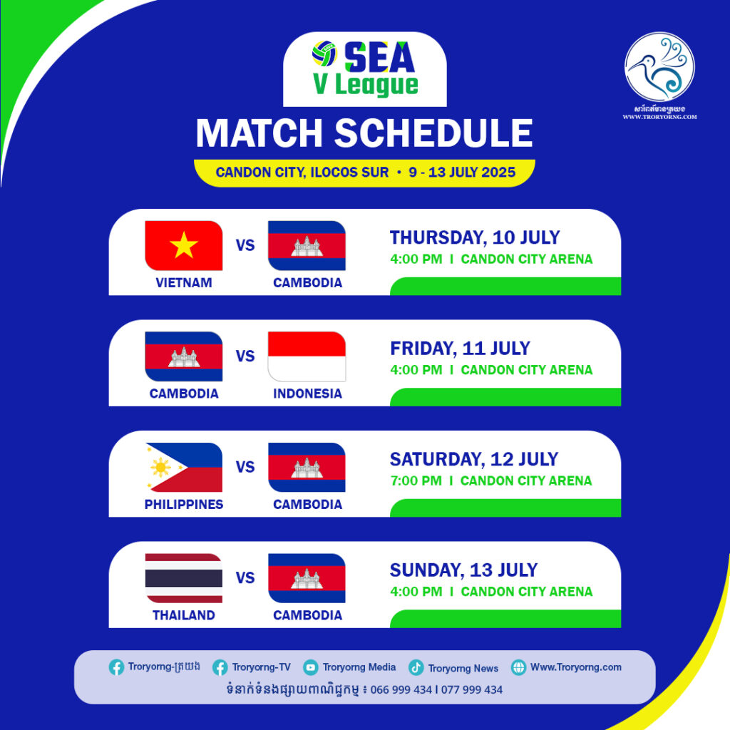សូមជម្រាបថាសម្រាប់ក្រុមបាល់ទះជម្រើសជាតិកម្ពុជា នឹងត្រូវឡើងទៅប្រកួតពានរង្វាន់ SEA V.League ឆ្នាំ២០២៥ ជាមួយក្រុមថៃ ឥណ្ឌូណេស៊ី និងហ្វីលីពីន និងវៀតណាម។