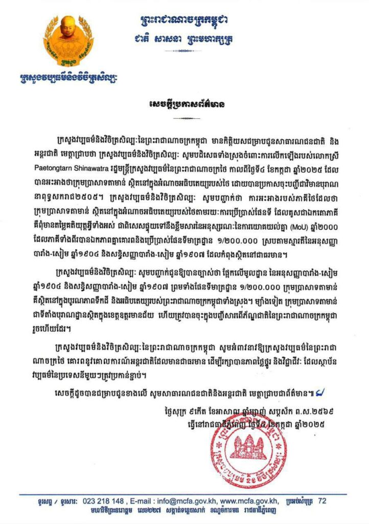 ភ្នំពេញ៖ ក្រសួងវប្បធម៌ និងវិចិត្រសិល្បៈ ចេញសេចក្តីប្រកាសព័ត៌មានដោយបដិសេធទាំងស្រុងចំពោះការលើកឡើងរបស់លោកជំទាវ Paetongtarn Shinawatra រដ្ឋមន្ត្រីក្រសួងវប្បធម៌នៃព្រះរាជាណាចក្រថៃ កាលពីថ្ងៃទី០៤ ខែកក្កដា ឆ្នាំ២០២៥ ដែលបានអះអាងថាក្រុមប្រាសាទតាមាន់ ស្ថិតនៅក្នុងអំណាចអធិបតេយ្យរបស់ថៃ ដោយបានប្រកាសចុះបញ្ជីជាវិមានបុរាណ នាពុទ្ធសករាជ២៥០៥។