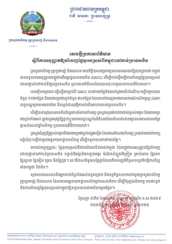 ភ្នំពេញ÷ ក្រសួងកសិកម្ម រុក្ខាប្រមាញ់ និងនេសាទ បានប្រកាសនៅថ្ងៃទី០៥ ខែកក្កដា ឆ្នាំ២០២៥នេះថា កម្ពុជាបានទទួលអនុញ្ញាតជាផ្លូវការច្បាស់លាស់ពីអគ្គរដ្ឋបាលគយចិន (GACC) ដើម្បីនាំចេញផ្លែទុរេនស្រស់ ដោយផ្ទាល់ទៅទីផ្សារចិន ស្របតាមពិធីសារដែលបានចុះហត្ថលេខាកាលពីខែមេសា ២០២៥។