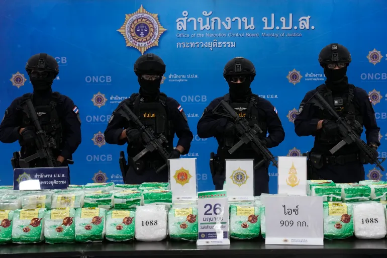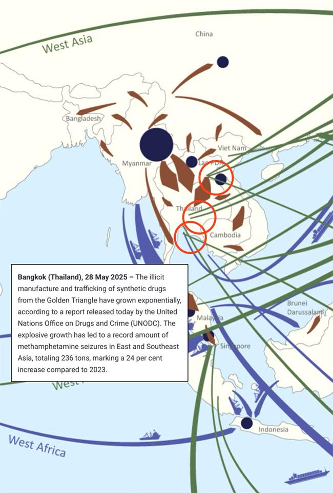 នៅក្នុងរបាយការណ៍មួយចេញផ្សាយកាលចុងខែឧសភា ឆ្នាំ២០២៥ UNODC បាននិយាយថា គ្រឿងញៀនប្រភេទ methamphetamine ២៣៦តោនត្រូវបានរឹបអូសកាលពី ឆ្នាំ២០២៤ នៅក្នុងតំបន់អាស៊ីខាងកើត និងអាស៊ីអាគ្នេយ៍ ពោលគឺចំនួនកើនឡើង២៤ភាគរយ បើធៀបទៅនឹងឆ្នាំ២០២៣។ បើតាម UNODC ថៃ បានក្លាយជាប្រទេសដំបូងគេក្នុងតំបន់ ដែលបានរឹបអូសគ្រឿងញៀន methamphetamine ជាង ១០០តោនកាលពីឆ្នាំ២០២៤។