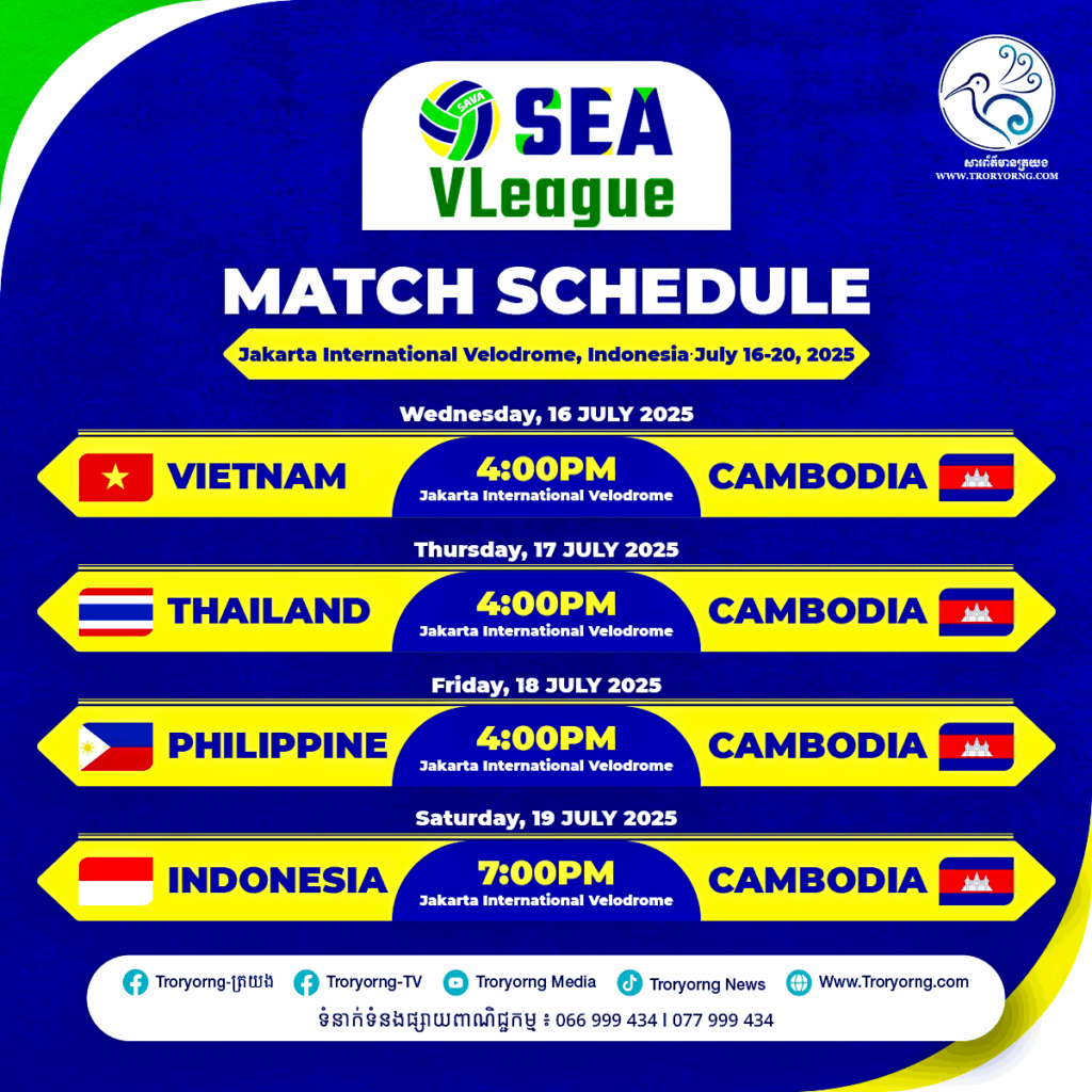 គួរបញ្ជាក់ថា កាប្រកួតពានរង្វាន់ SEA V.League ឆ្នាំ២០២៥ ជើងទី២ នៅប្រទេសឥណ្ឌូណេស៊ី ចាប់ផ្តើមនៅថ្ងៃទី១៦ នេះ នឹងបញ្ចប់នៅថ្ងៃទី២០ ខែកក្កដា ឆ្នាំ២០២៥ នៅក្នុងសាល Jakarta International Velodrome នៅទីក្រុងហ្សាកាតា ប្រទេសឥណ្ឌូណេស៊ី ៕