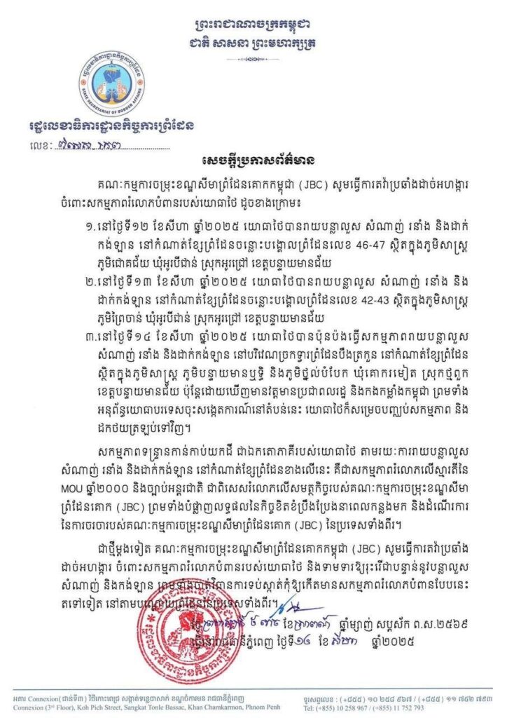 JBC ថា សកម្មភាពទាំងនេះជាការរំលោភលើស្មារតីនៃ MOU ឆ្នាំ 2000 និងច្បាប់អន្តរជាតិ បំផ្លាញលទ្ធផលការចរចាប្រចាំរវាងកម្ពុជា-ថៃ។