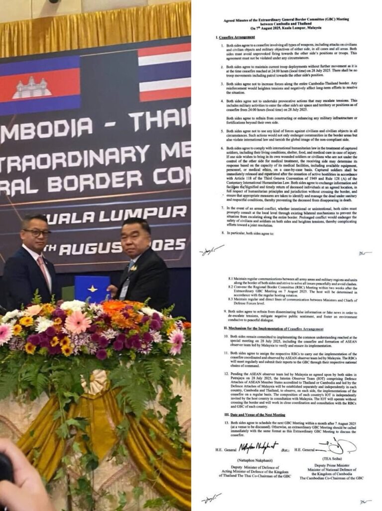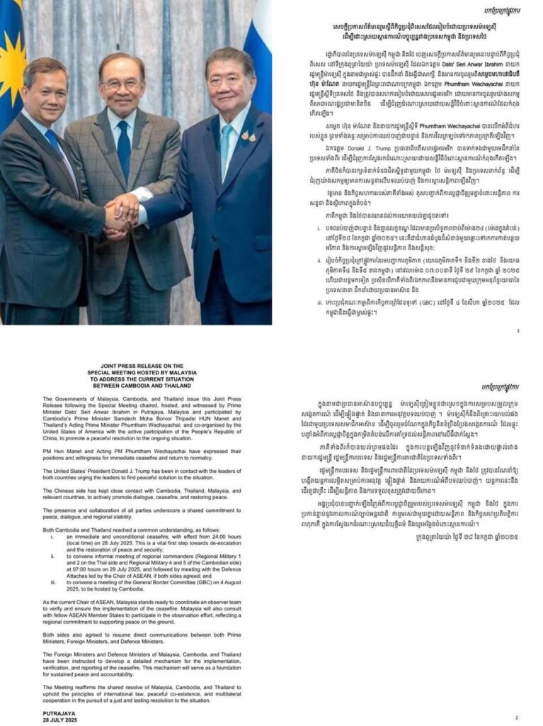 ជាក់ស្តែង កិច្ចប្រជុំពិសេសរវាងសម្តេចធិបតីនាយករដ្ឋមន្ត្រី និងនាយករដ្ឋមន្ត្រីស្តីទីថៃ ដោយមានការសម្របសម្រួលពីនាយករដ្ឋមន្ត្រីម៉ាឡេស៊ីក្នុងនាមជាប្រធានអាស៊ាន រួមជាមួយតំណាងសហរដ្ឋអាមេរិក និងសាធារណរដ្ឋប្រជាមានិតចិនជាសាក្សី នាថ្ងៃទី២៨ ខែកក្កដា បានសម្រេចបានការនូវបទឈប់បាញ់បន្ទាន់ឥតលក្ខខណ្ឌ ដែលបានចូលជាធរមាននៅយប់ម៉ោង០០:០០ ឈានចូលថ្ងៃទី២៩ ខែកក្កដា ឆ្នាំ២០២៥។ តាមរយៈលទ្ធផលនៃកិច្ចប្រជុំបានបើកច្រកបន្តដល់ការរៀបចំឱ្យមានកិច្ចប្រជុំវិសាមញ្ញនៃគណៈកម្មាធិការព្រំដែនទូទៅកម្ពុជា-ថៃ (GBC) ដែលបានឯកភាពលើលក្ខខណ្ឌនៃបទឈប់បាញ់ និងការរៀបចំយន្តការអនុវត្ត (ថ្ងៃទី០៧ ខែសីហា) ព្រមទាំងកិច្ចប្រជុំគណៈកម្មាធិការព្រំដែនថ្នាក់យោធភូមិភាគ (RBC) ក្នុងគោលដៅរក្សាឱ្យបាននូវភាពស្ងប់ស្ងាត់ និងអនុវត្តបទឈប់បាញ់ឱ្យមានប្រសិទ្ធភាព។