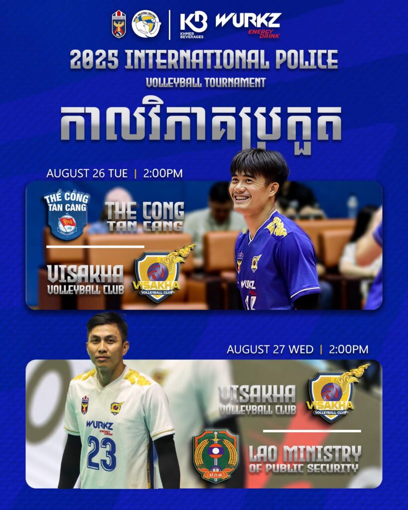 ក្លិបបាល់ទះវិសាខា (តំណាងកម្ពុជា) ចូលរួមការប្រកួត 2025 International Police Volleyball Tournament នៅប្រទេសវៀតណាម ដែលមាន៤ប្រទេសចូលរួម (កម្ពុជា ឥណ្ឌូនេស៊ី ឡាវ និងវៀតណាម) ចាប់ផ្តើមប្រកួតពីថ្ងៃទី ២៦ ដល់ទី ៣០ ខែសីហា ឆ្នាំ២០២៥ នៅកីឡដ្ឋាន Military Zone 7 Indoor Stadium។