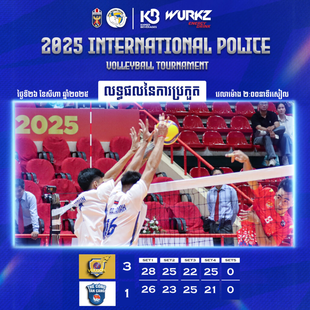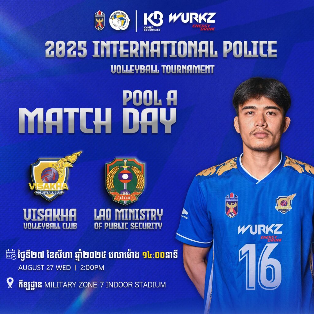 ថ្ងៃទី២៧ ខែសីហា ឆ្នាំ២០២៥ ប្រកួតពានរង្វាន់ International Police Volleyball Tournament ២០២៥ វេលាម៉ោង ២:០០នាទីរសៀល នៅកីឡដ្ឋាន Military Zone 7 Indoor Stadium នៅប្រទេសវៀតណាម។