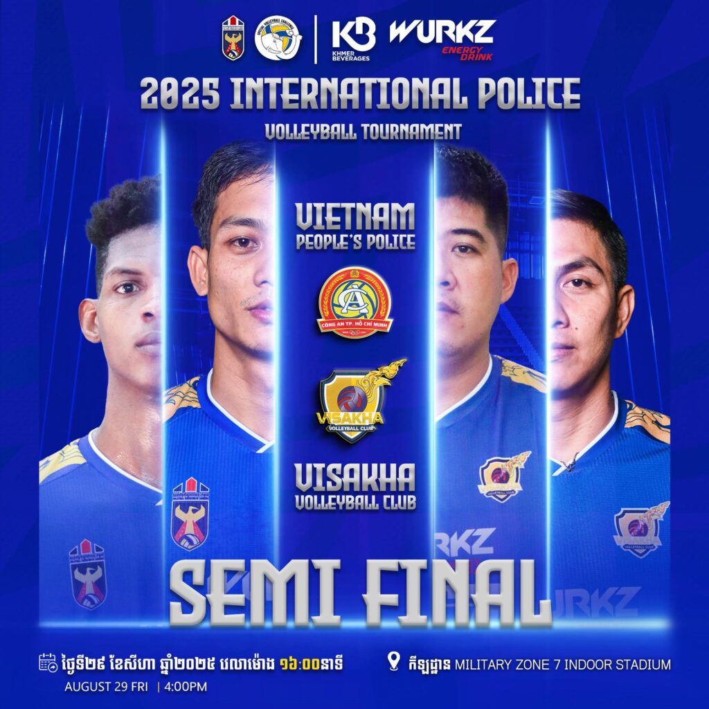 ក្លិបបាល់ទះវិសាខា (តំណាងកម្ពុជា) នឹងត្រូវបន្តជួបជាមួយក្រុម Vietnam People’s Police វគ្គពាក់កណ្ដាលផ្ដាច់ព្រ័ត្រ ប្រកួតពានរង្វាន់ International Police Volleyball Tournament ២០២៥ ថ្ងៃទី២៩ ខែសីហា ឆ្នាំ២០២៥ វេលាម៉ោង ៤:០០នាទីរសៀល នៅកីឡដ្ឋាន Military Zone 7 Indoor Stadium នៅប្រទេសវៀតណាម។