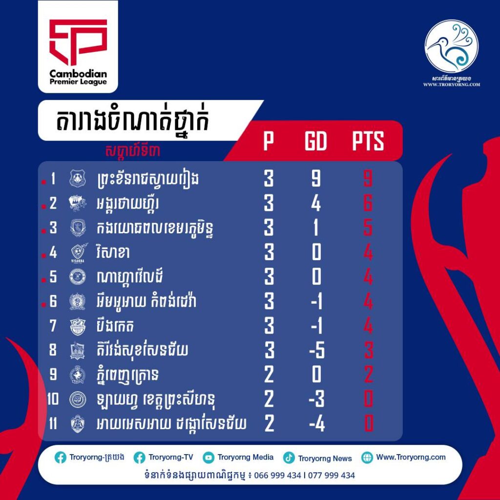 តារាងចំណាត់ថ្នាក់ ត្រឹមសប្ដាហ៍ទី៣៖