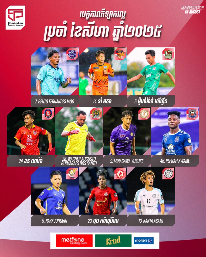 ក្រុមហ៊ុន Cambodian Premier League បានបញ្ចេញបេក្ខភាពកីឡាករឆ្នើមប្រចាំខែសីហា នៅលីគកំពូលកម្ពុជា រដូវកាល ២០២៥-២៦ ដែលមានដូចខាងក្រោម៖