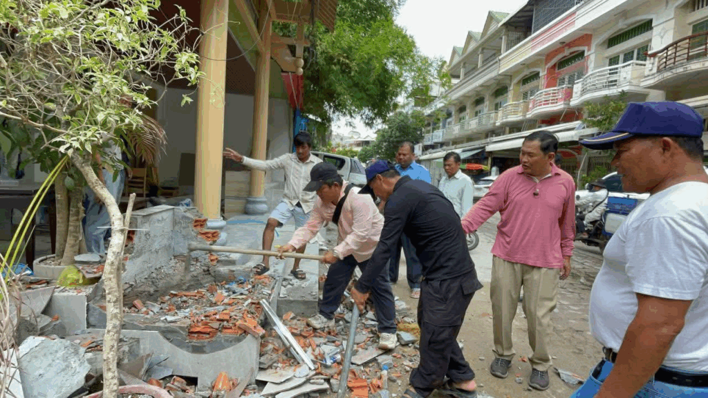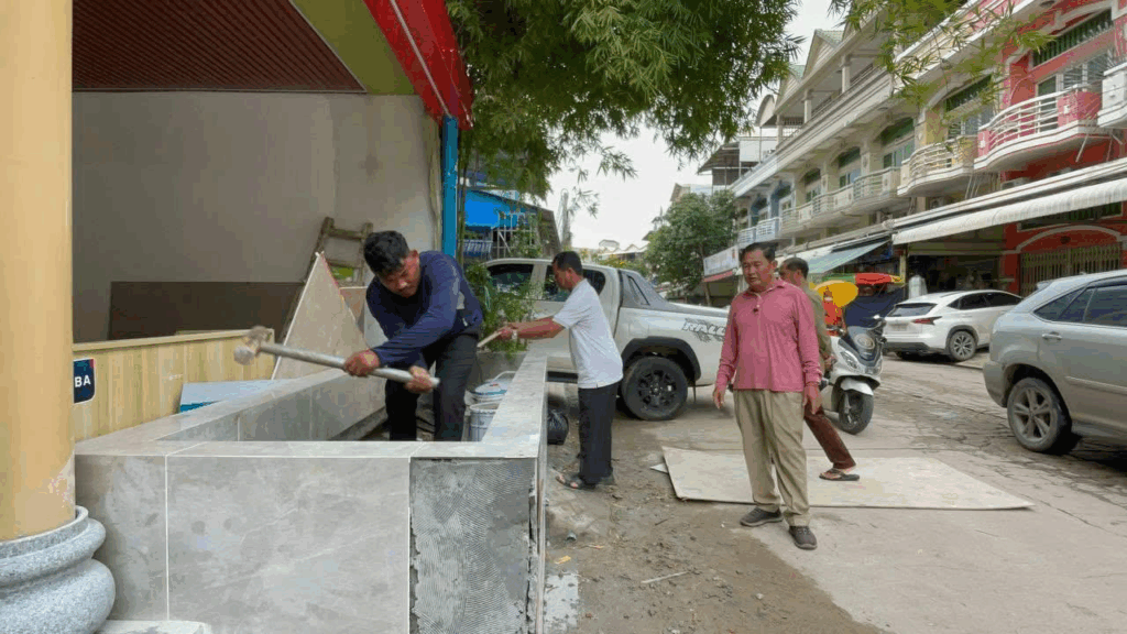 ភ្នំពេញ ៖ សំណង់ជនជាតិចិនសាងសង់រំលោភលើចំណីផ្លូវ បិទមាត់លូ នៅក្នុងភូមិព្រៃទា១ សង្កាត់ចោមចៅទី៣ ខណ្ឌពោធិ៍សែនជ័យ រាជធានីភ្នំពេញ ត្រូវបានអាជ្ញាធរខណ្ឌ សង្កាត់ចុះទៅចាត់វិធានការ វាយបេតុងចេញវិញ កាលពីព្រឹកថ្ងៃទី០៣ ខែកញ្ញា ឆ្នាំ២០២៥។