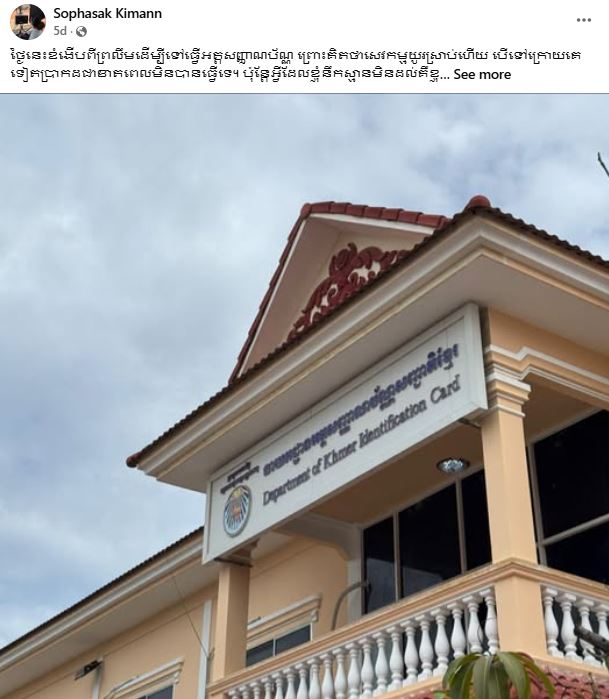 អ្វីដែលជាកិច្ចខិតខំប្រឹងប្រែងរបស់ថ្នាក់ដឹកនាំ ក្រសួង និងមន្ត្រីពាក់ព័ន្ធ កំពុងតែធ្វើឱ្យពលរដ្ឋ សរសើរ ហើយសរសើរចេញពីចិត្ត ថែមទៀតផង។ តាមរយៈគណនីមួយឈ្មោះ សុភក្តិស័ក្តិ គីមសាន បានបង្ហោះពីបទពិសោធន៍ និង ភាពងាយស្រួលដែលខ្លួនទទួលបានពេលទៅធ្វើអត្តសញ្ញាណបណ្ណ បន្ថែមពីក្នុងនោះសូម្បីបងប្អូនពលករខ្មែរ ដែលទៅរស់នៅស្រុកគេជិត៣០ឆ្នាំ ក៏មន្ត្រីយើងបានផ្ដល់នូវការយកចិត្តទុកខ្ពស់ផងដែរ។