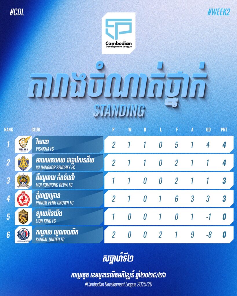គួរបញ្ជាក់ថា ការប្រកួតខេមបូឌានលីគអភិវឌ្ឍន៍ Cambodian Development League ឆ្នាំ២០២៥/២៦ មាន ៦ក្រុមចូលរួមប្រកួតប្រជែង ដូចជា ក្លិបាបាល់ទាត់កណ្ដាលយូណាធីត ក្លិបបាល់ទាត់ភ្នំពេញក្រោន ក្លិបបាល់ទាត់វិសាខា ក្លិបបាល់ទាត់ឡាយអិនឃីង ក្លិបបាល់ទាត់អឹមអូអាយ កំពង់ដេវ៉ា និងក្លិបបាល់ទាត់ អាយអេសអាយរដង្កោសែនជ័យ៕
