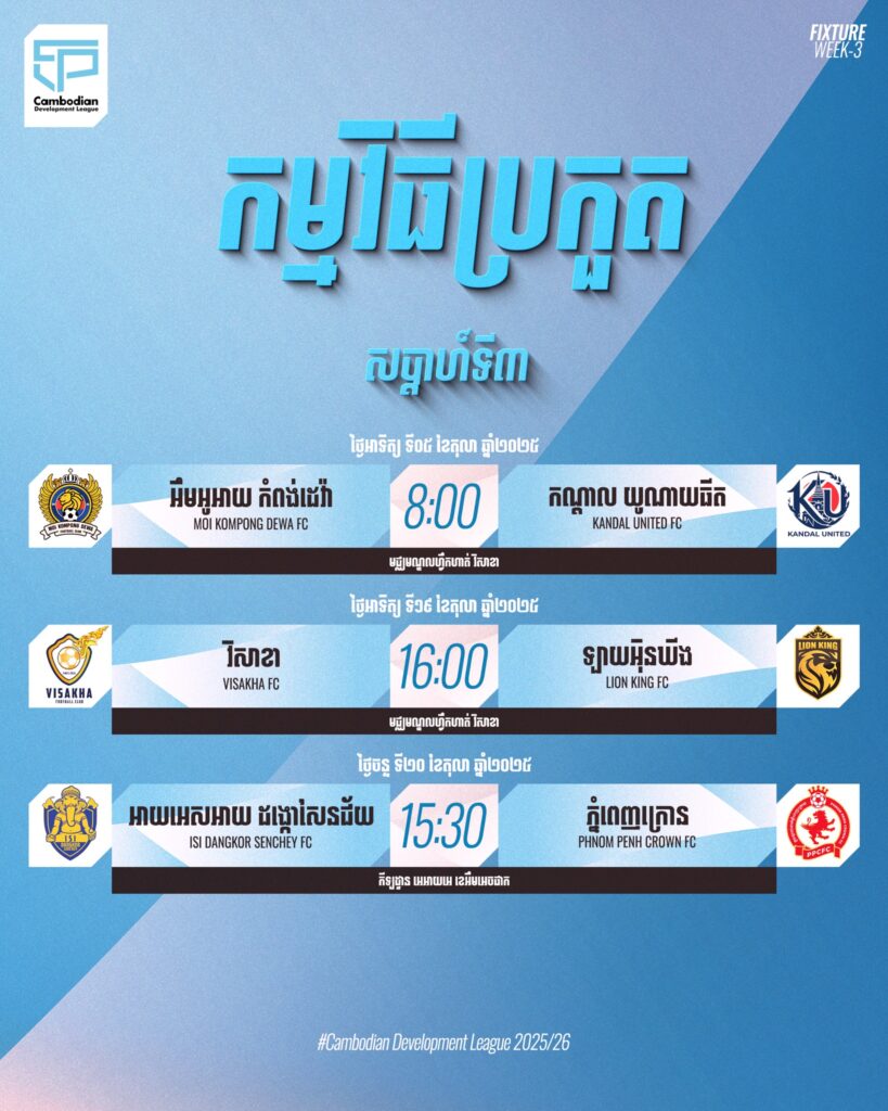 ការប្រកួតលីគអភិវឌ្ឍន៍ Cambodian Development League ឆ្នាំ២០២៥/២៦ ដែលជារដូវកាលដំបូង ដើម្បីជំរុញការកសាងធនធានកីឡាករបាល់ទាត់កម្ពុជា ក៏ដូចជាដើម្បីផ្ដល់ឱកាសដល់កីឡាករ ដែលពុំសូវមានវត្តមានក្នុងការប្រកួតលីគកម្ពុជា យុវជនក្មេងៗ បានចូលរួម និងបង្ហាញសមត្ថភាពរបស់ខ្លួន។ ការប្រកួតត្រូវបានចាប់ផ្ដើមប្រកួតសម្រាប់សប្តាហទី១ នៅថ្ងៃអាទិត្យ ទី១៤ ខែកញ្ញា ឆ្នាំ២០២៥ ខាងមុខនេះ។