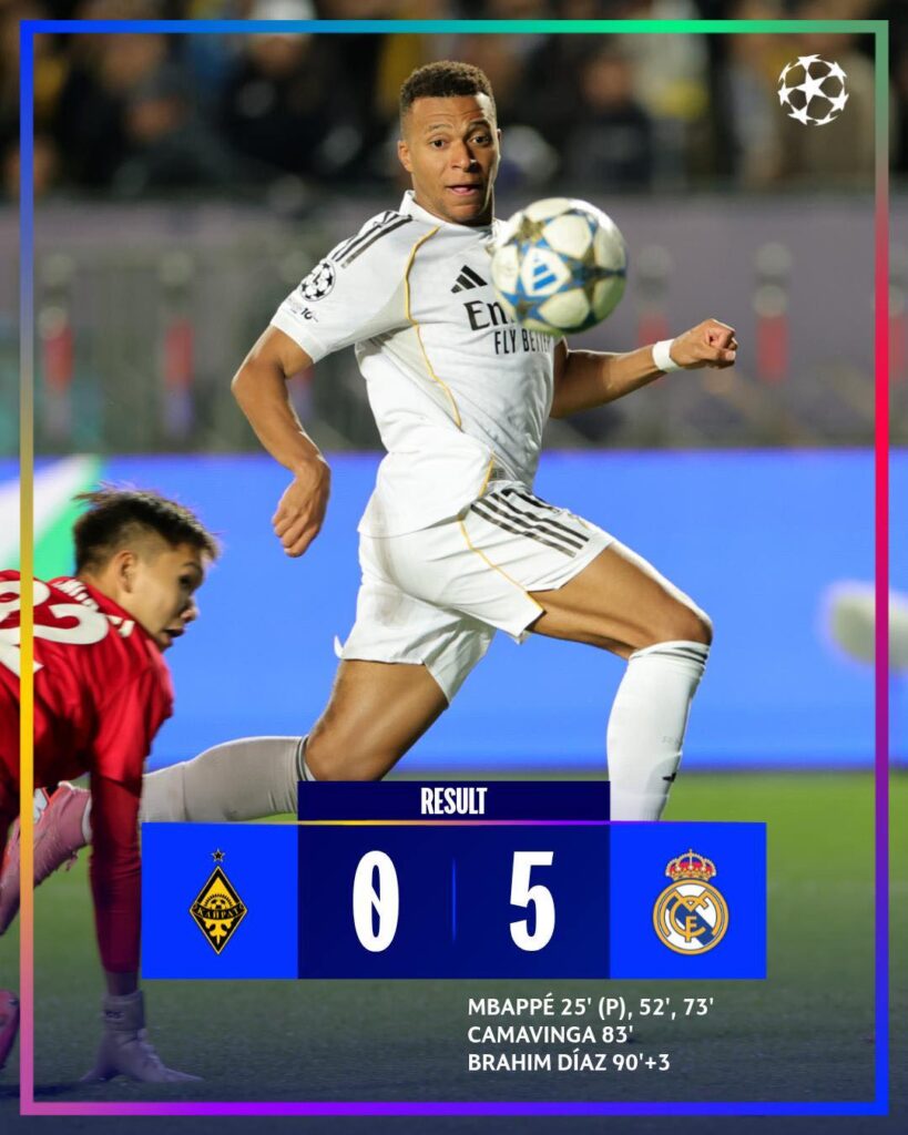 ម្ចាស់ជើងឯកអឺរ៉ុប ១៥សម័យ Real Madrid បានធ្វើដំណើរមកកាន់ប្រទេសកាហ្សាក់ស្ថាន ប្រកួតកួតជាមួយ Kairat Almaty ក្នុងពានរង្វាន់លំដាប់ទី១ ប្រចាំទ្វីបអឺរ៉ុប UEFA Champions League កាលពីយប់មិញ ដោយកឈ្នះក្រុមម្ចាស់ផ្ទះក្នុងលទ្ធផល ៥-០ ក្រោមក្រសែភ្នែកអ្នកគាំទ្រជាង ២ម៉ឺន ៣ពាន់នាក់។