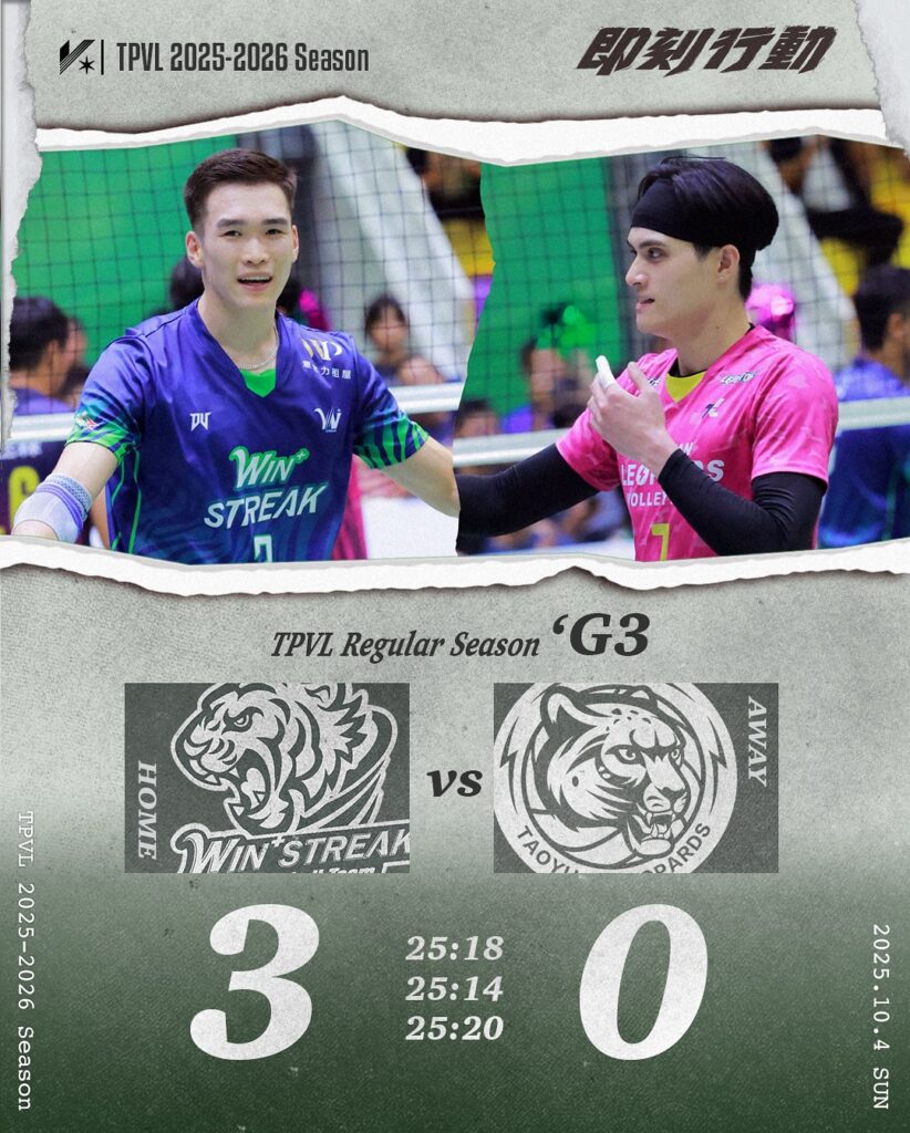 ចំពោះកាលពីសប្តាហ៍ទី១ ក្រុមបាល់ទះ Win Streak ប្រកួតបើកឆាកយកឈ្នះ Taipei East Power ក្នុងលទ្ធផល ៣-០ កាលពីថ្ងៃទី២៧ ខែកញ្ញា ឆ្នាំ២០២៥ ពានរង្វាន់លីគបាល់ទះតៃវ៉ាន់ Enterprise Volleyball League រដូវកាល ២០២៥-២៦។