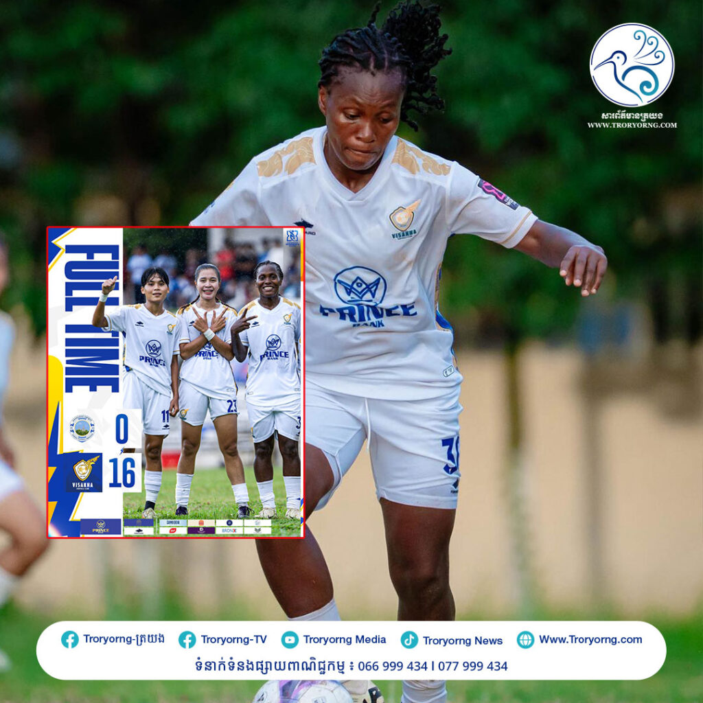 កីឡាការិនី Blessing របស់វិសាខា ស៊ុត ១២គ្រាប់ម្នាក់ឯង ក្នុងជំនួបយកឈ្នះសមាគមកីឡាខេត្តកណ្តាល ក្នុងលទ្ធផល ១៦ទល់និង០ ពានរង្វាន់លីគនារីកម្ពុជា (Cambodian Women League) រដូវកាលឆ្នាំ២០២៥ សប្តាហ៍ទ៧ កាលពីថ្ងៃទី៤ ខែតុលា ឆ្នាំ២០២៥។