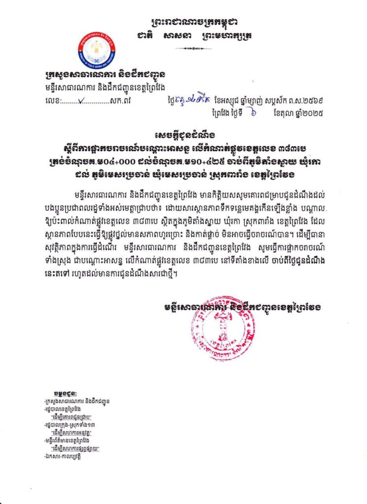 ព្រៃវែង ៖ មន្ទីរសាធារណការ និងដឹកជញ្ជូនខេត្តព្រៃវែង បានចេញសេចក្តីជូនដំណឹង រសៀលថ្ងៃទី០៦ ខែតុលា ឆ្នាំ២០២៥ ស្តីពីការផ្អាកចរាចរណ៍បណ្តោះអាសន្ន លើកំណាត់ផ្លូវខេត្តលេខ ៣៨៣បេ ត្រង់ចំណុចគ.ម០៤+០០០ ដល់ចំណុចគ.ម១០+៤២៥ ចាប់ពីភូមិតាំងស្នាយ ឃុំរកា ដល់ ភូមិមេសរប្រចាន់ ឃុំមេសរប្រចាន់ ស្រុកពារាំង ខេត្តព្រៃវង ។