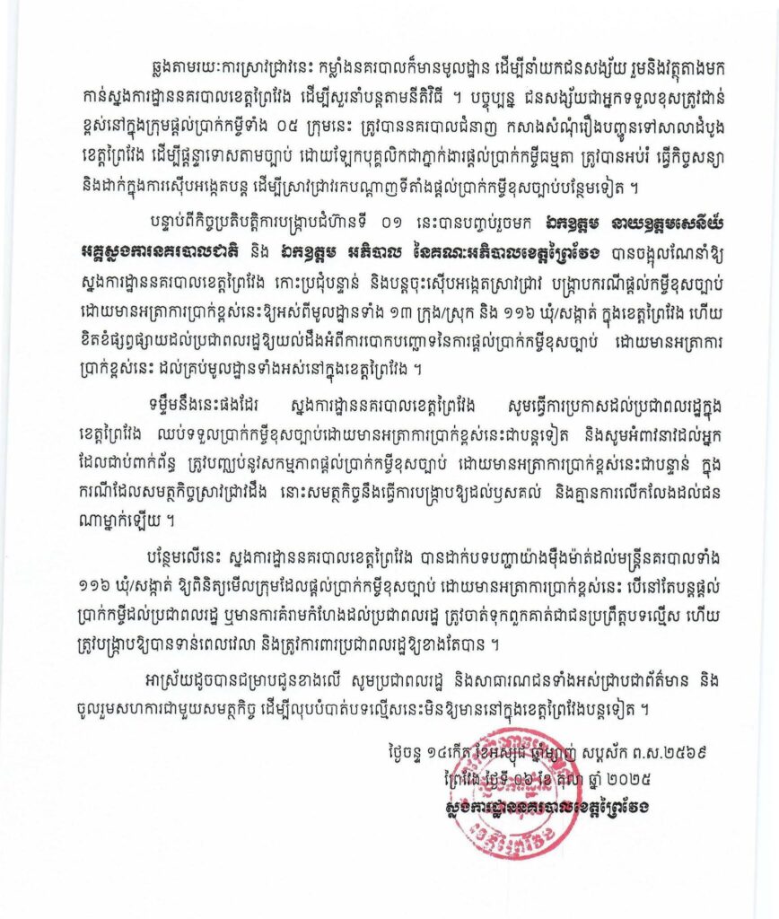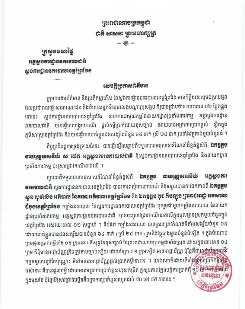 បើតាម ក្រុមការងារព័ត៌មាន និងប្រតិកម្មរហ័ស នៃស្នងការដ្ឋាននគរបាលខេត្តព្រៃវែង បានជម្រាបជូន ដល់ប្រជាពលរដ្ឋ សាធារណៈជន និងពិសេសអ្នកនិយមលេងបណ្តាញសង្គម ឱ្យបានជ្រាបថា រយៈពេល ០២ ថ្ងៃកន្លង ទៅនេះ ស្នងការដ្ឋាននគរបាលខេត្តព្រៃវែង សហការជាមួយកម្លាំងនាយកដ្ឋានប្រឆាំងភេរវកម្ម អគ្គស្នងការដ្ឋាន នគរបាលជាតិ បានធ្វើការបង្ក្រាបករណី ផ្តល់កម្ចីប្រាក់ដោយខុសច្បាប់ ដោយមានអត្រាការប្រាក់ខ្ពស់ ស្ថិតក្នុង ភូមិសាស្ត្រខេត្តព្រៃវែង និងបានធ្វើការឃាត់ខ្លួនជនសង្ស័យចំនួន ៦៤ នាក់ ស្រី ២៤ នាក់ រួមទាំងវត្ថុតាងមួយចំនួនធំ ។ កិច្ចប្រតិបត្តការទ្រង់ទ្រាយធំនេះ បានធ្វើឡើងបន្ទាប់ពីទទួលបានអនុសាសន៍ណែនាំដ៏ខ្ពង់ខ្ពស់ពី នាយឧត្តមសេនីយ៍ ស ថេត អគ្គស្នងការនគរបាលជាតិ ឱ្យស្នងការដ្ឋាននគរបាលខេត្តព្រៃវែង និងនាយកដ្ឋាន ប្រឆាំងភារវកម្ម ចុះស្រាវជ្រាវករណីខាងលើ ។