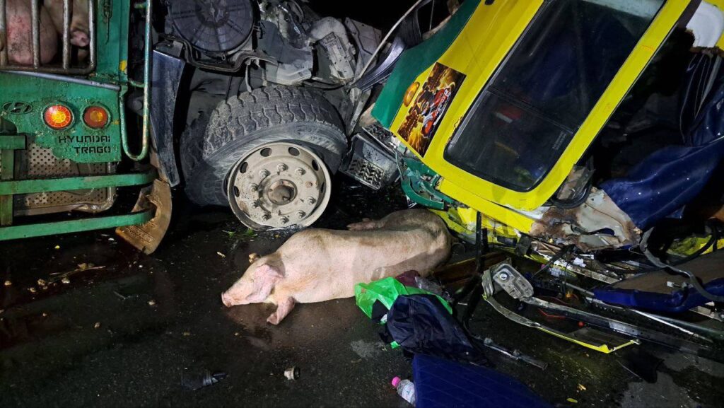 បាត់ដំបង ៖ រថយន្តដឹកជ្រូកមួយគ្រឿងសង្ស័យអ្នកបើកបរងងុយដេក ហ្វ្រាំងមិនទាន់ជ្រុលទៅបុកបារ៉ាស់ហាមឃាត់ ហើយជ្រុលទៅបុករថភ្លើង បណ្តាលឱ្យខ្ទេចកាប៊ីនរថយន្តទាំងស្រុង របួសធ្ងន់ស្រាល៣នាក់ កាលពីវេលាម៉ោង២និង២៣នាទីរំលងអធ្រាត្រចូល ថ្ងៃទី០៩ ខែតុលា ឆ្នាំ២០២៥ នៅផ្លូវហាយវ៉េ ភូមិអូរដំបង ឃុំអូរដំបង១ ស្រុកសង្កែ ខេត្តបាត់ដំបង ។
