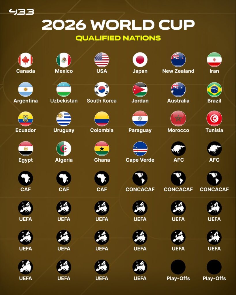 គិតត្រឹមថ្ងៃទី១៤ ខែតុលា ឆ្នាំ២០២៥ ប្រទេសចំនួន២២ កក់កៅអីទៅលេងពានរង្វាន់ FIFA World Cup 2026 ដែលមានសហរដ្ឋអាមេរិក កាណាដា និងម៉ិកស៊ិក រួមគ្នាជាសហម្ចាស់ផ្ទះ គ្រោងនឹងចាប់ពីថ្ងៃទី១១ ខែមិថុនា រហូតដល់ថ្ងៃទី១៩ ខែកក្កដា ឆ្នាំ២០២៦៖