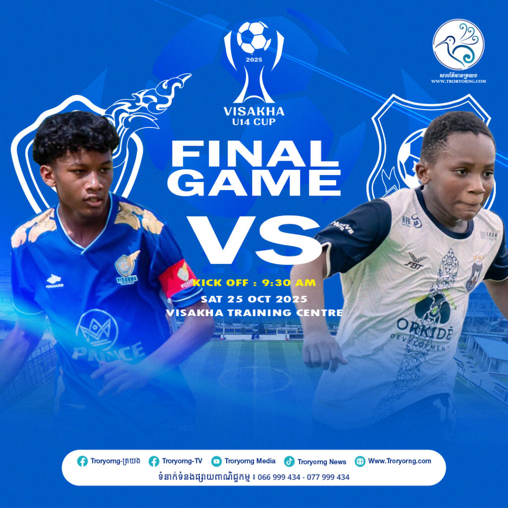 ក្រុមយុវជនអាយុក្រោម ១៤ឆ្នាំ របស់ក្លិបបាល់ទាត់វិសាខា នឹងត្រូវជួបជាព្រះខ័នរាជស្វាយរៀង ក្នុងជំនួនចុងក្រោយដើម្បីកាត់សេចក្ដីរកក្រុមដែលមានពិន្ទុខ្ពស់ជាងគេ នឹងក្លាយជាម្ចាស់ពានរង្វាន់ VISAKHA U14 CUP លើកទី១ ឆ្នាំ២០២៥។