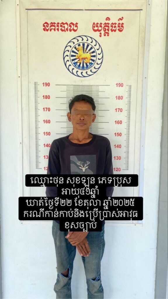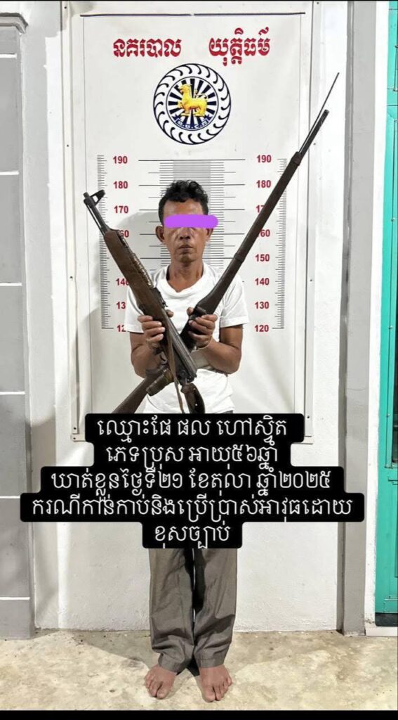 កំពង់ស្ពឺ៖ ស្នងការនគរបាលខេត្តកំពង់ស្ពឺ កម្លាំងអធិការនគរបាលស្រុកឱរ៉ាល់ បានអនុវត្តប្រតិបត្តិការចុះស្រាវជ្រាវ បន្ទាប់ពីទទួលព័ត៌មានពីពលរដ្ឋល្អម្នាក់ អំពីករណីលាក់ទុក និងកាន់កាប់ប្រើប្រាស់អាវុធដោយខុសច្បាប់ នៅចំណុចជើងភ្នំម្រេច ភូមិអូរអញ្ចា ឃុំតាសាល ស្រុកឱរ៉ាល់ ខេត្តកំពង់ស្ពឺ។ក្រោមការដឹកនាំផ្ទាល់ពី វរសេនីយ៍ឯក ប៊ុត ប៊ុនធឿន អធិការនគរបាលស្រុកឱរ៉ាល់ កម្លាំងបានចុះត្រួតពិនិត្យដល់ដីចម្ការរបស់ ឈ្មោះ ផែ ផល ហៅ ស្វិត ភេទប្រុស អាយុ ៥៦ ឆ្នាំ នៅភូមិអូរអញ្ចា ឃុំតាសាល ស្រុកឱរ៉ាល់។