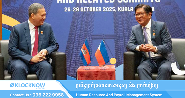 គូឡាឡាំពួ៖ នាព្រឹកថ្ងៃទី២៦ ខែតុលា ឆ្នាំ២០២៥ ក្នុងឱកាសចូលរួមកិច្ចប្រជុំកំពូលអាស៊ាន លើកទី៤៧ នៅទីក្រុងគូឡាឡាំពួ ប្រទេសម៉ាឡេស៊ី សម្តេចមហាបវរធិបតី ហ៊ុន ម៉ាណែត នាយករដ្ឋមន្រ្តី នៃកម្ពុជា និងឯកឧត្តម Ferdinand Romualdez Marcos Jr. ប្រធានាធិបតី នៃសាធារណរដ្ឋហ្វីលីពីន បានជួបពិភាក្សាការងារទ្វេភាគី ដោយបានឯកភាពបន្តពង្រឹង និងពង្រីកទំនាក់ទំនង និងកិច្ចសហប្រតិបត្តិការរវាងប្រទេសទាំងពីរ។