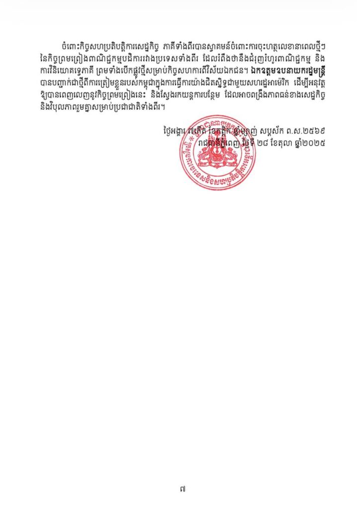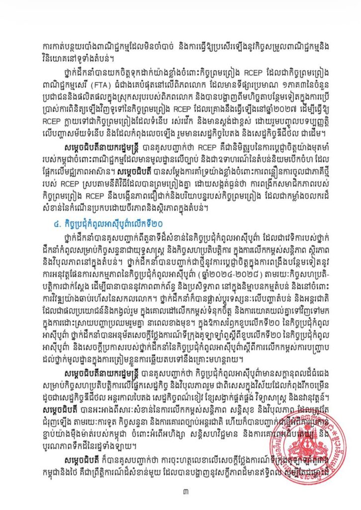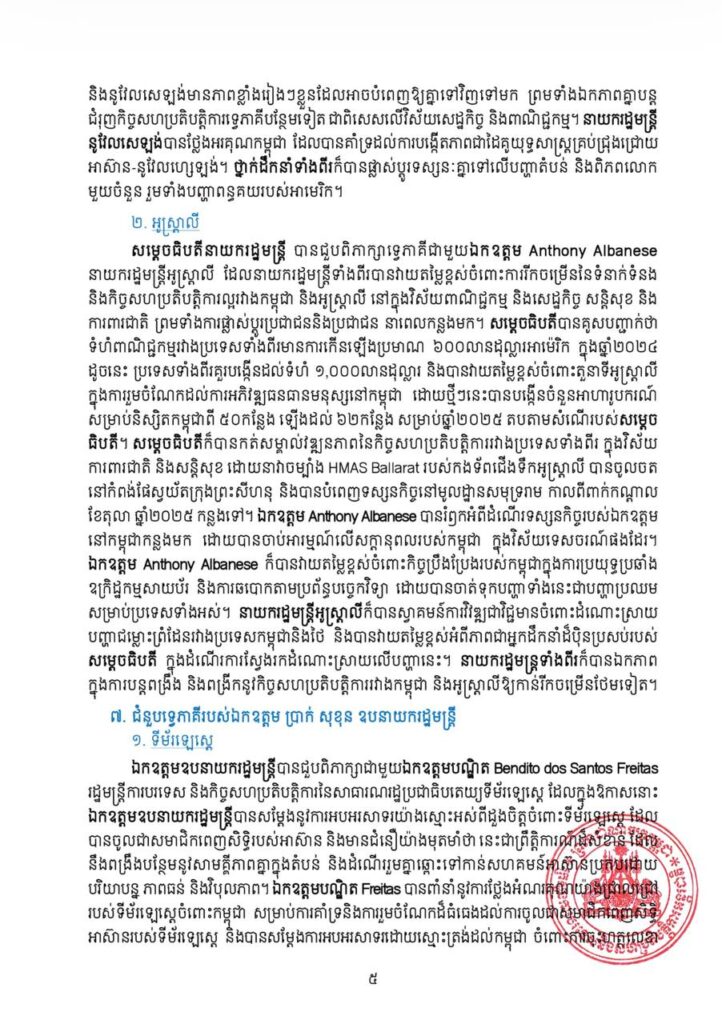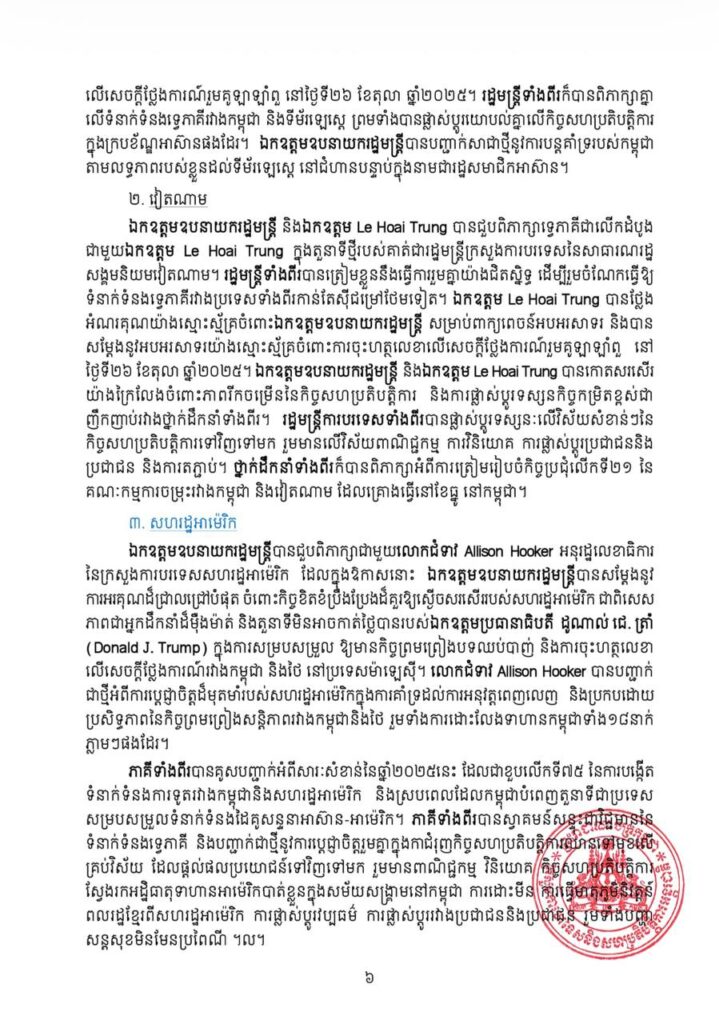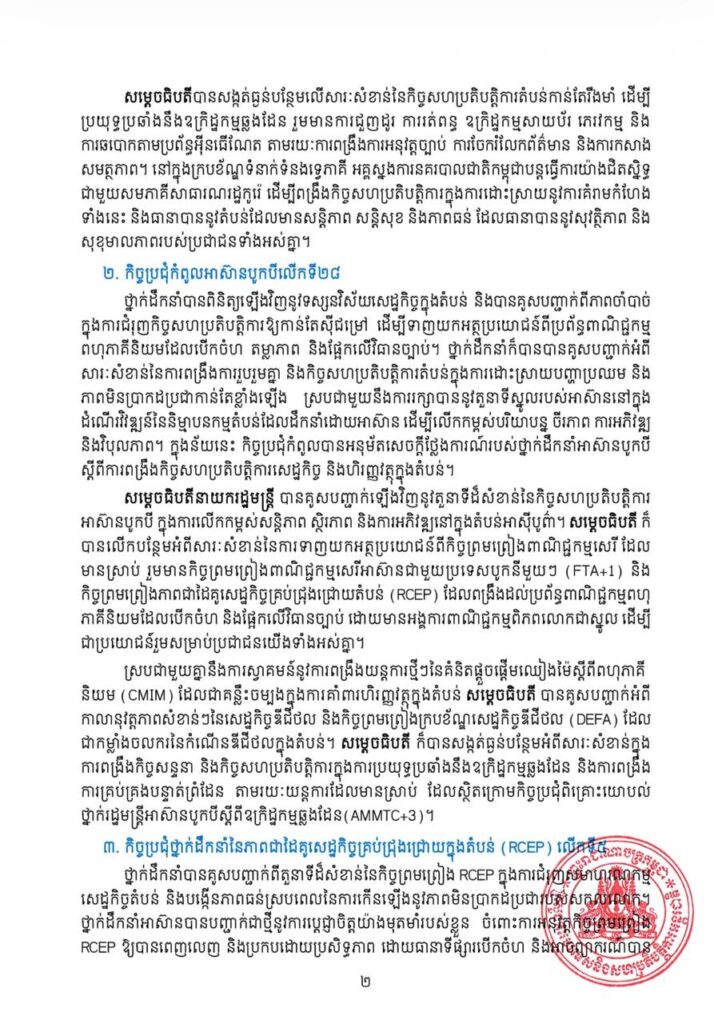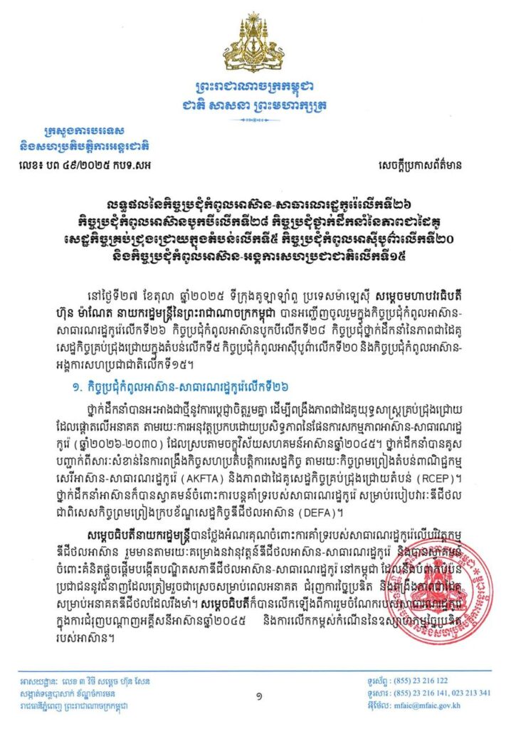 សេចក្តីប្រកាសព័ត៌មានបានបញ្ជាក់ថា សម្តេចធិបតីក៏បានគូសបញ្ជាក់អំពីសារៈសំខាន់នៃការចុះហត្ថលេខាលើ «សេចក្តីថ្លែងការណ៍រួមស្តីពីកិច្ចព្រមព្រៀងសន្តិភាព ទីក្រុងកូឡាឡាំពួ» រវាងកម្ពុជានិងថៃ កាលពីថ្ងៃទី២៦ ខែតុលា ឆ្នាំ២០២៥។ ព្រឹត្តិការណ៍ដ៏សំខាន់នេះបានបង្ហាញនូវសក្ខីភាពដ៏មានឥទ្ធិពលថា សូម្បីតែជម្លោះដ៏លំបាកបំផុត ក៏អាចត្រូវបានដោះស្រាយតាមរយៈគោលការណ៍នៃការគោរពគ្នាទៅវិញទៅមក ការអត់ធ្មត់ និងតាមរយៈការទូត។