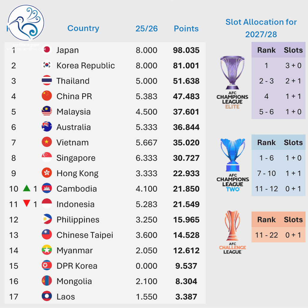 ក្លិបកម្ពុជា ឡើងឈរលើឥណ្ឌូណេស៊ី សារជាថ្មី នៅតារាងចំណាត់ថ្នាក់ AFC Club Competitions Ranking 2025-26 ក្រោយព្រះខ័នរាជស្វាយរៀង និងភ្នំពេញក្រោន រកបានជ័យជម្នះក្នុងពានរង្វាន់ AFC Challenge League កាលពីថ្ងៃទី២៩ ខែតុលា ឆ្នាំ២០២៥។