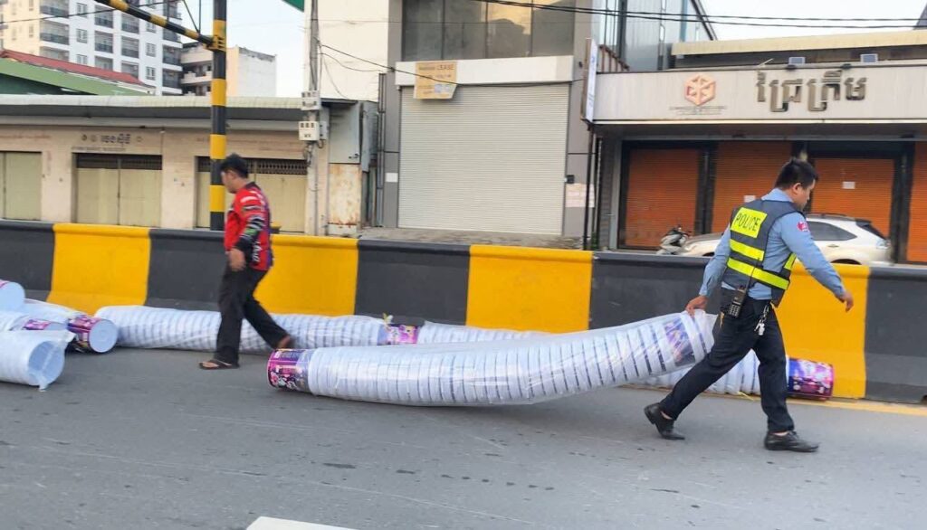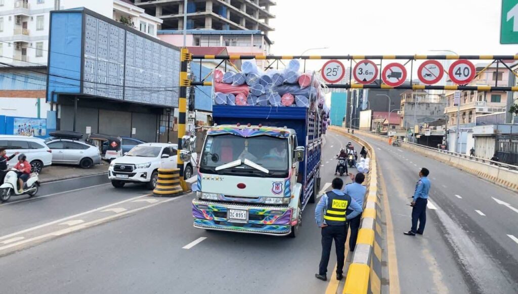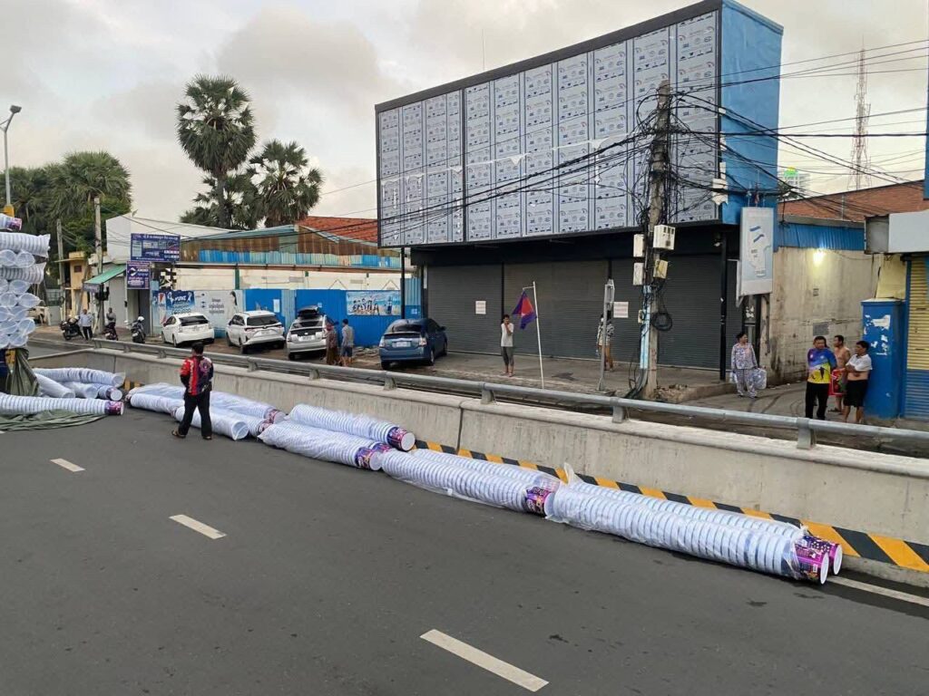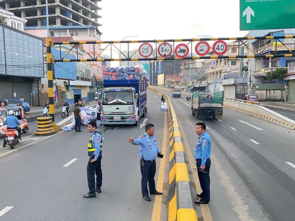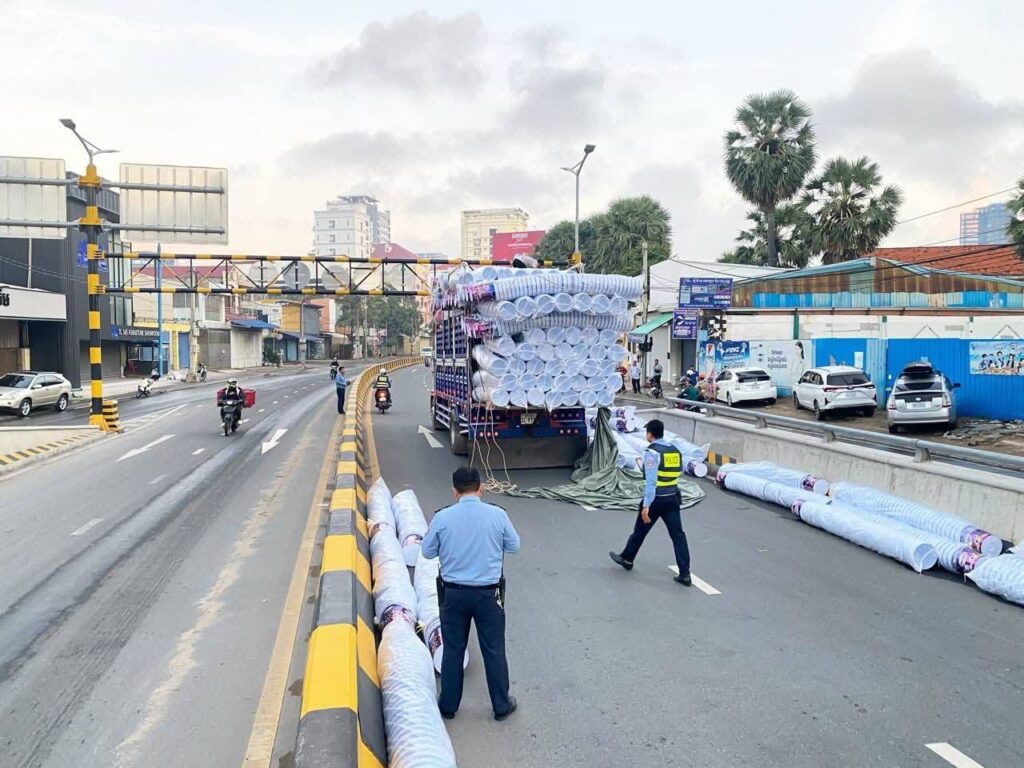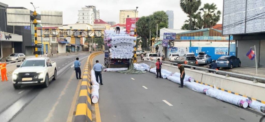 ភ្នំពេញ ៖ រថយន្តដឹកទំនិញមួយគ្រឿង ដឹកធុងជ័រសំពីងសំពោងគ្មានសណ្តាប់ធ្នាប់ បើកចុះពីលើស្ពានអាកាសទាក់របាដែកស្ពាន បណ្តាលឱ្យធ្លាក់ធុងជ័ររាយប៉ាយពេញផ្លូវ បង្កឱ្យរាំងស្ទះចរាចរណ៍ រហូតដល់សមត្ថកិច្ចចុះទៅអន្តរាគមន៍ សម្រេចបិទផ្អាកចរាចរណ៍ផ្លូវពាក់ព័ន្ធត្រូវឆ្លងកាត់មួយចំនួនជាបណ្តោះអាសន្ន ។
