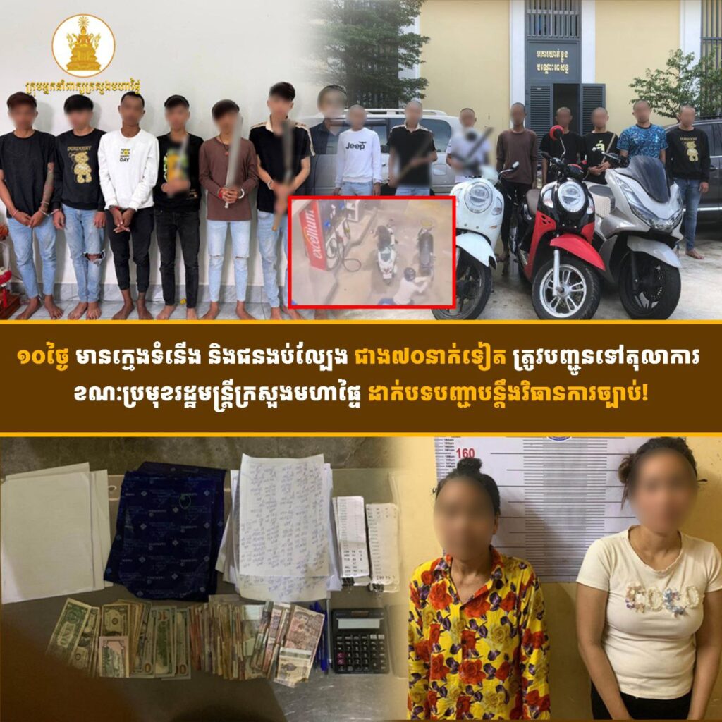 ក្នុងរយៈពេល១០ថ្ងៃ គិតចាប់ពីថ្ងៃទី២១ ដល់ថ្ងៃទី៣០ ខែតុលា ឆ្នាំ២០២៥នេះ សមត្ថកិច្ចនគរបាលជាតិ បានចុះបង្ក្រាបក្មេងទំនើងសរុប១៩ករណី ឃាត់ខ្លួនមនុស្ស៧០នាក់ ខណៈករណីល្បែងស៊ីសងបង្ក្រាបបាន៦ករណី ឃាត់ខ្លួនជនងប់ល្បែង និងអ្នកពាក់ព័ន្ធចំនួន៣នាក់។ នេះបើតាមលោក ទូច សុឃៈ អ្នកនាំពាក្យរងក្រសួងមហាផ្ទៃ។
