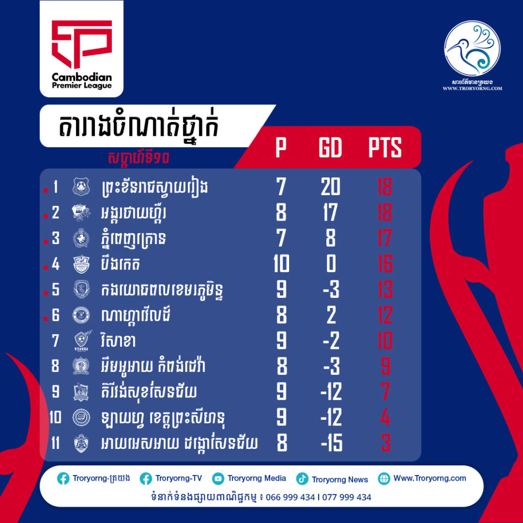 តារាងចំណាត់ថ្នាក់ គិតត្រឹមសប្តាហ៍ទី១០