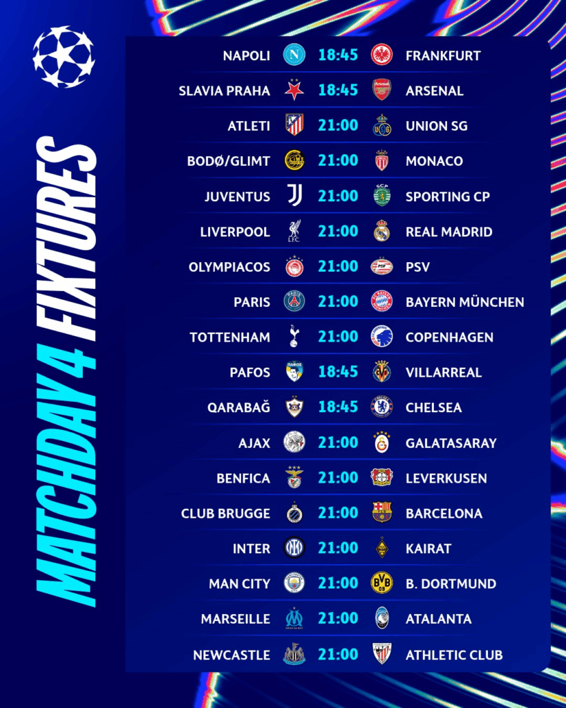 ការប្រកួតពានរង្វាន់លំដាប់ទី១ ប្រចាំទ្វីបអឺរ៉ុប UEFA Champions League 2025-26 វគ្គ League Phaseបានឈានមកដល់ជុំទី៤ហើយ ដោយនៅរាត្រីនេះនឹងមានការប្រកួតចំនួន ១៨គូ។