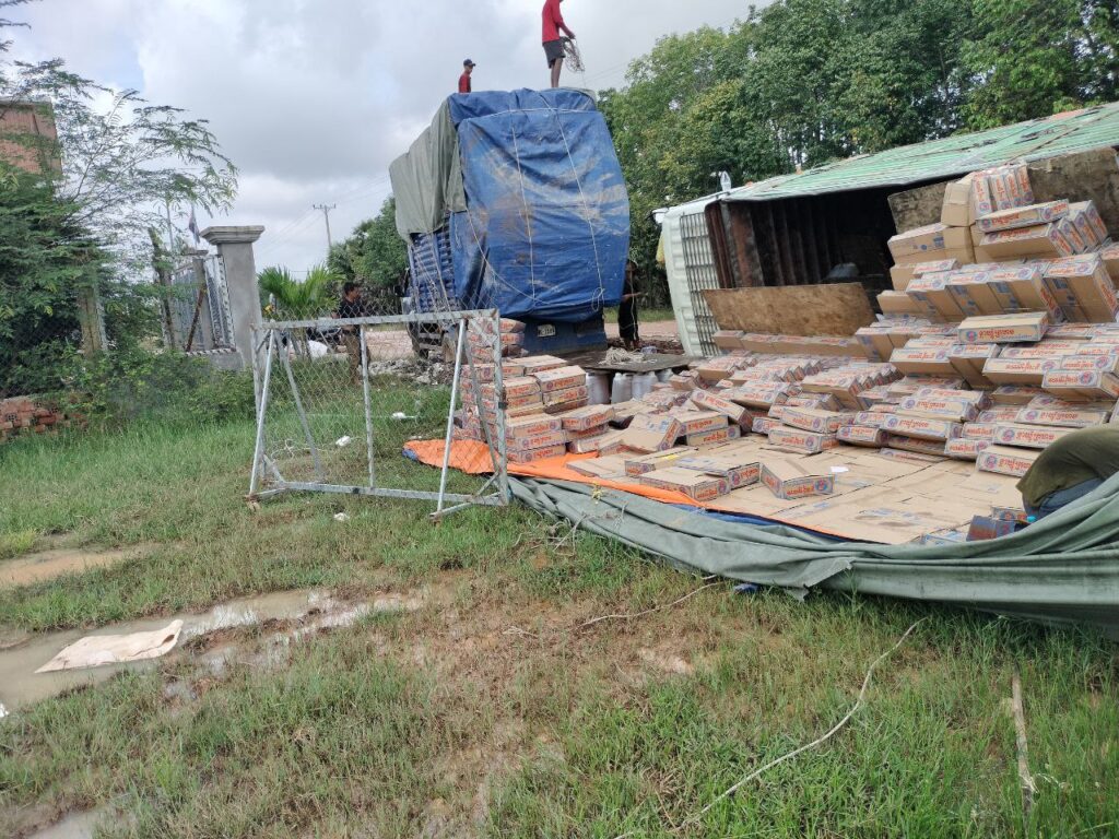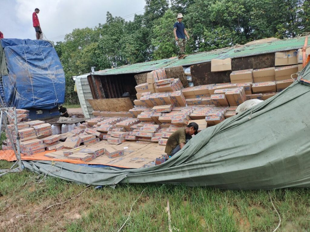 ស្វាយរៀង ៖ រថយន្តដឹកទំនិញមកពីវៀតណាមមួយគ្រឿង ដឹកធ្ងន់ហួសហេតុ មិនប្រមាណខ្លួន បើកឆ្លងកាត់ផ្លូវជង្ហុក បណ្តាលឱ្យក្រឡាប់បះជើងច្រូង ចាក់ឥវ៉ាន់ មី ប្រេងឆា ចោលពេញផ្លូវ កាលពីវេលាម៉ោង៩និង៣០នាទីព្រឹក ថ្ងៃទី១៣ ខែវិច្ឆិកា ឆ្នាំ២០២៥ នៅក្នុងឃុំបុសមន ស្រុករំដួល ខេត្តស្វាយរៀង ។