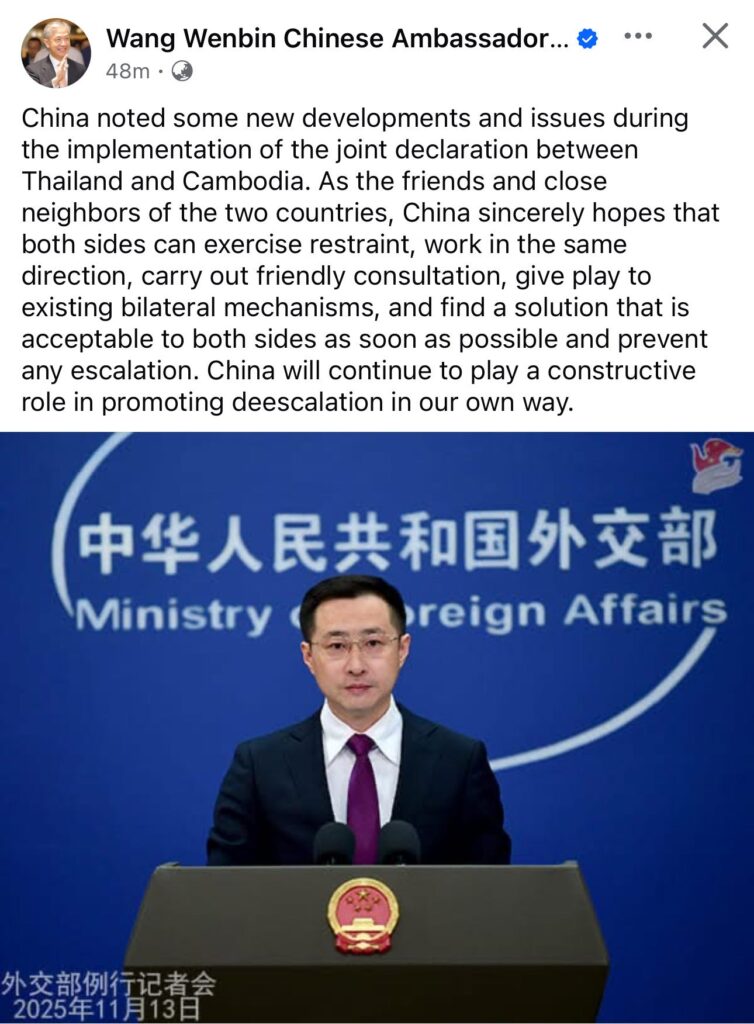 ហេតុការណ៍បាញ់ប្រហារពីសំណាក់កងយោធាថៃ មកលើប្រជាពលរដ្ឋស្លូតត្រង់កាលពីថ្ងៃទី១២ ខែវិច្ឆិកា ឆ្នាំ២០២៥ កន្លងទៅ ហើយបានបណ្ដាលឱ្យមានអ្នកស្លាប់ម្នាក់ និងរបួស៤នាក់ កំពុងល្បីសាយភាយលើពិភពលោកហើយ។ ក្នុងនោះយើងបានសង្កេតឃើញថា ប្រទេសចិន តាមរយៈលោកឯកអគ្គរដ្ឋទូត វ៉ាង វិនពីន (Wang Wenbin) បានថ្លែងសារតាមរយៈបណ្ដាញទំនាក់ទំនងសង្គមថា៖ «ប្រទេសចិនបានកត់សម្គាល់ឃើញនូវ ការវិវឌ្ឍថ្មីៗ និងបញ្ហាមួយចំនួន អំឡុងពេលនៃការអនុវត្តសេចក្តីប្រកាសរួមរវាងប្រទេសថៃ និងកម្ពុជា។