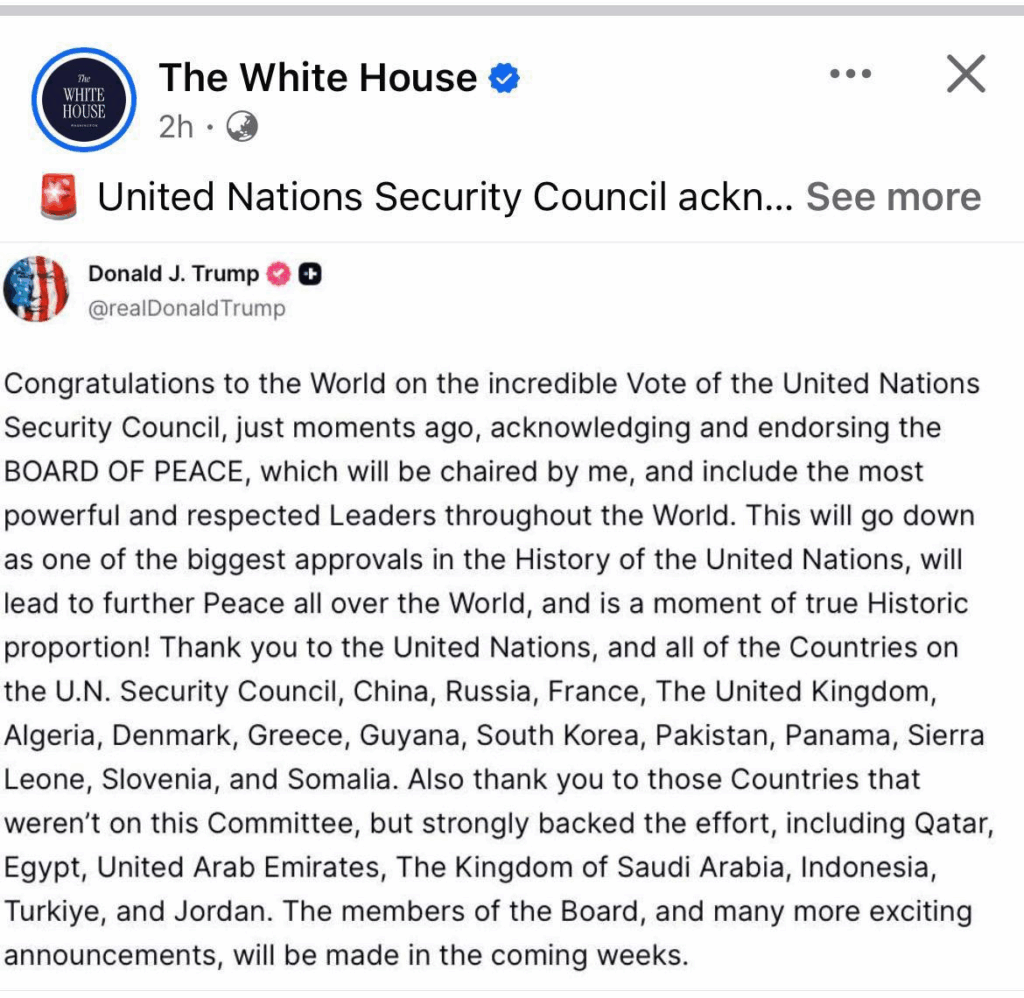 ពីទំព័រហ្វេសប៊ុកផ្លូវការរបស់ សេតវិមាន បានលើកឡើងថា៖ សូមអបអរសាទរដល់ពិភពលោក ចំពោះ ការបោះ ឆ្នោតដ៏អស្ចារ្យ របស់ក្រុមប្រឹក្សាសន្តិសុខអង្គការសហប្រជាជាតិ កាលពីប៉ុន្មាននាទីមុននេះ ដែលបាន ទទួលស្គាល់ និងគាំទ្រ នូវ ក្រុមប្រឹក្សាសន្តិភាព (BOARD OF PEACE) ដែលនឹងត្រូវដឹកនាំដោយខ្ញុំ (លោក ត្រាំ) និងរួមបញ្ចូលនូវមេដឹកនាំដ៏មានឥទ្ធិពល និងគួរឱ្យគោរពបំផុតនៅទូទាំងពិភពលោក។